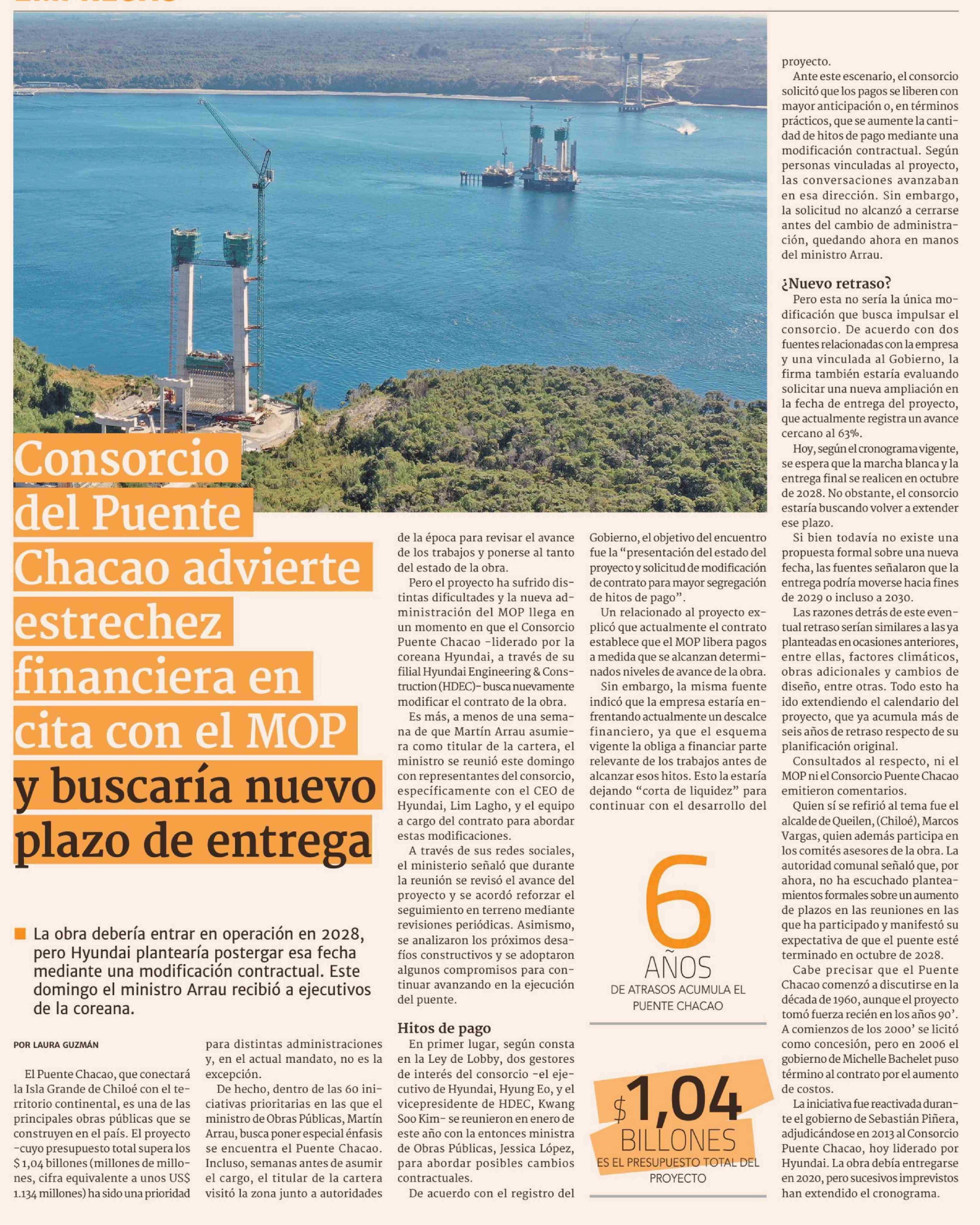 Consorcio del Puente Chacao advierte estrechez financiera en cita con el MOP y buscaría nuevo plazo de entrega 16-03-2026 Diario Financiero |