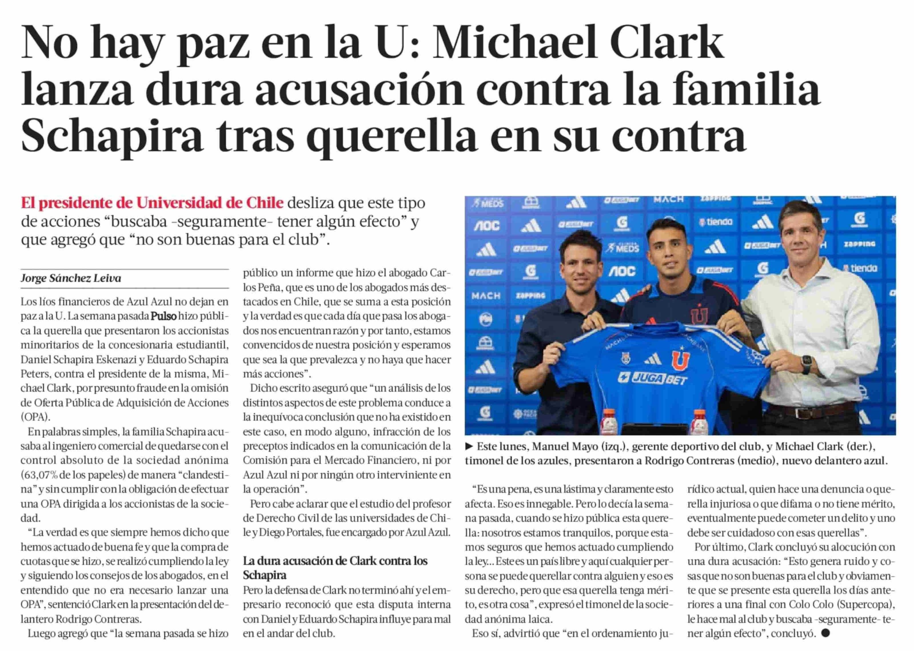 No hay paz en la U: Michael Clark lanza dura acusación contra la familia Schapira tras querella en su contra 28-01-2025 La Tercera |