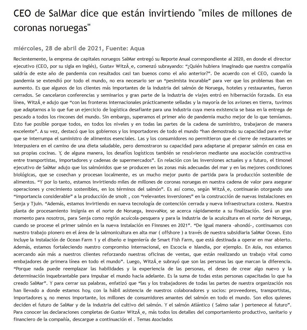 CEO de SalMar dice que están invirtiendo "miles de millones de coronas noruegas" 28-04-2021 Aqua.cl - Chile |