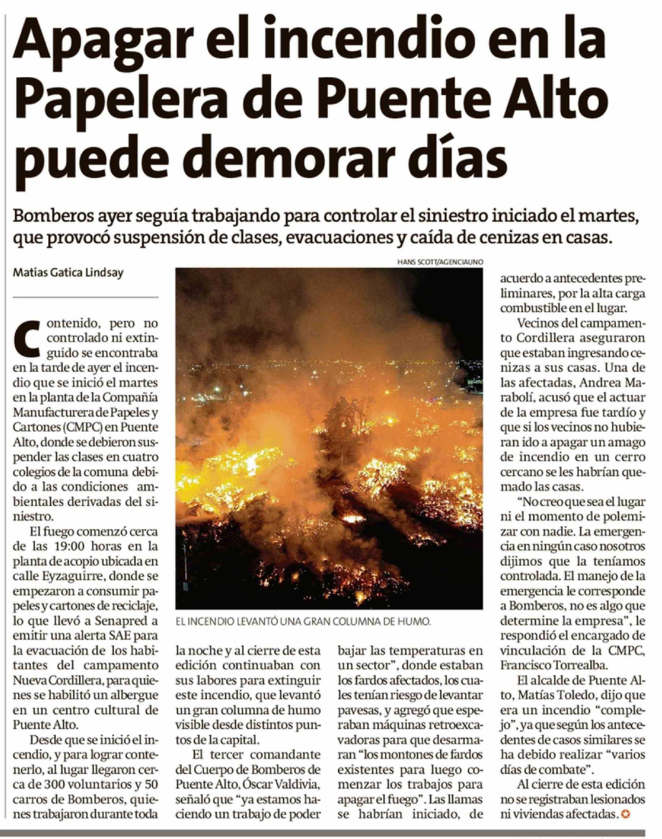 | Título: | Apagar el incendio en la Papelera de Puente Alto puede demorar días |
