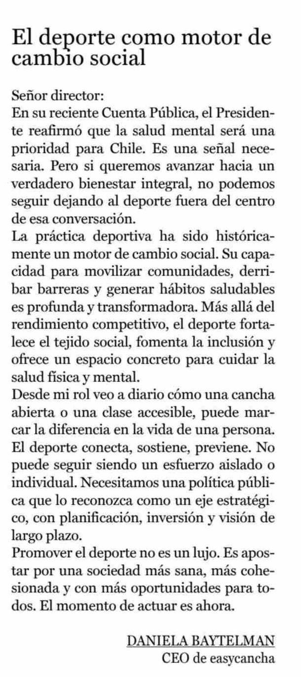 CARTAS: El deporte como motor de cambio social 07-06-2025 La Prensa de Curicó |