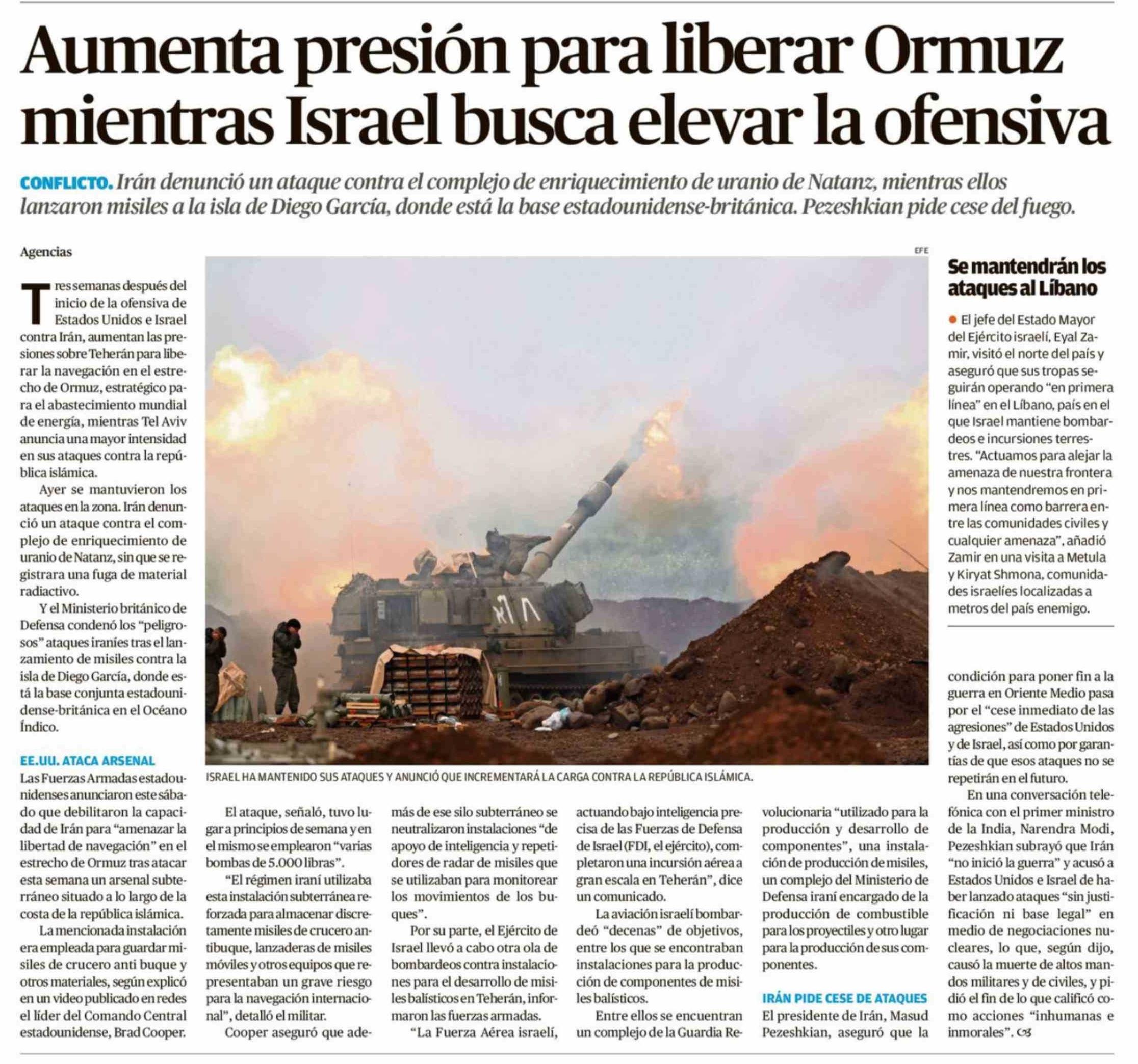 | Título: | Aumenta presión para liberar Ormuz mientras Israel busca elevar la ofensiva |