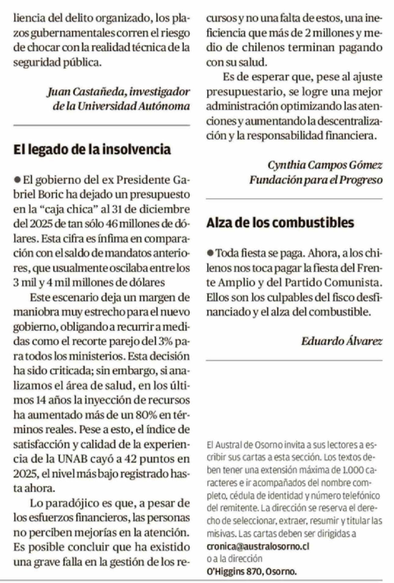 Cartas: El legado de la insolvencia 26-03-2026 El Austral de Osorno |