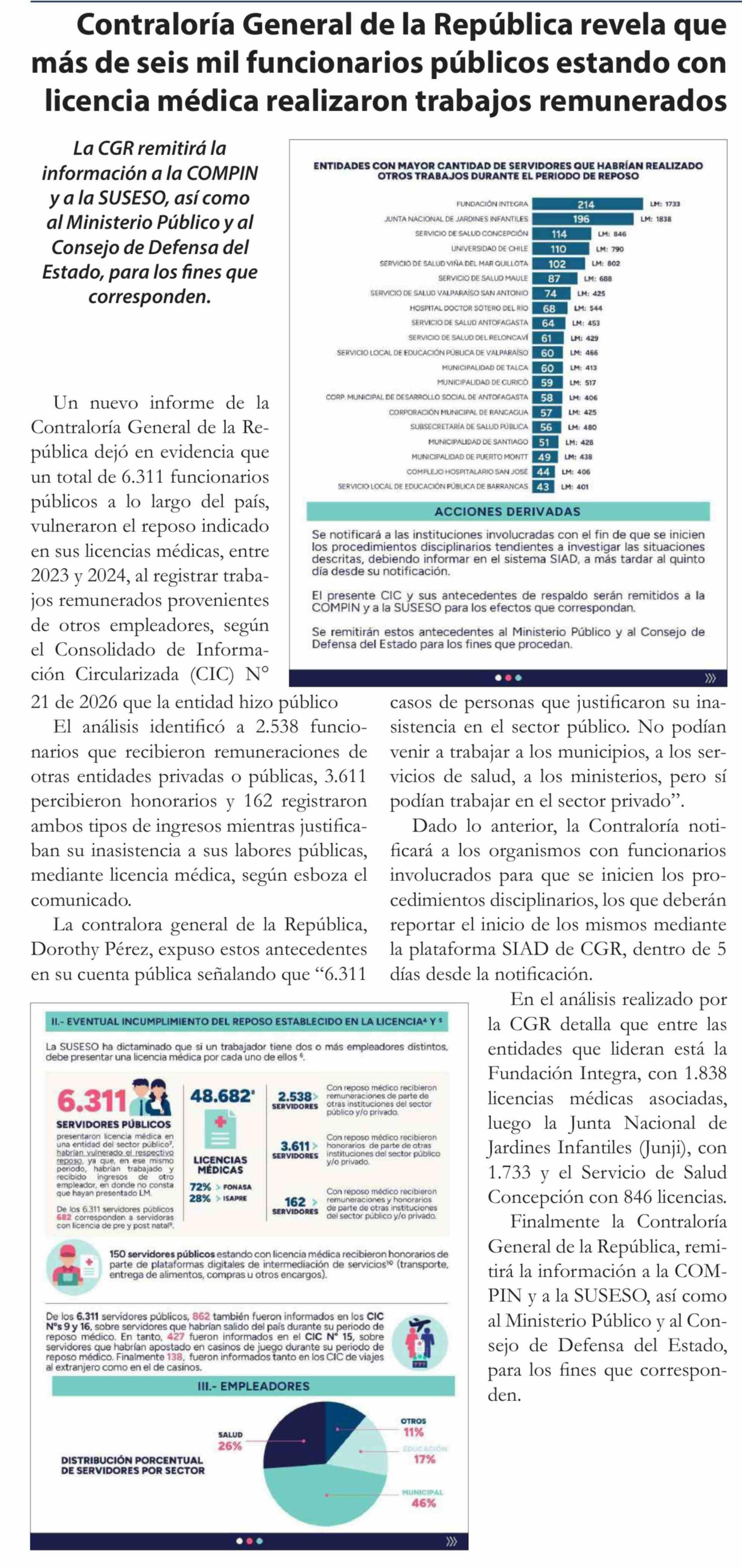 Contraloría General de la República revela que más de seis mil funcionarios públicos estando con licencia médica realizaron trabajos remunerados 01-04-2026 El Divisadero |
