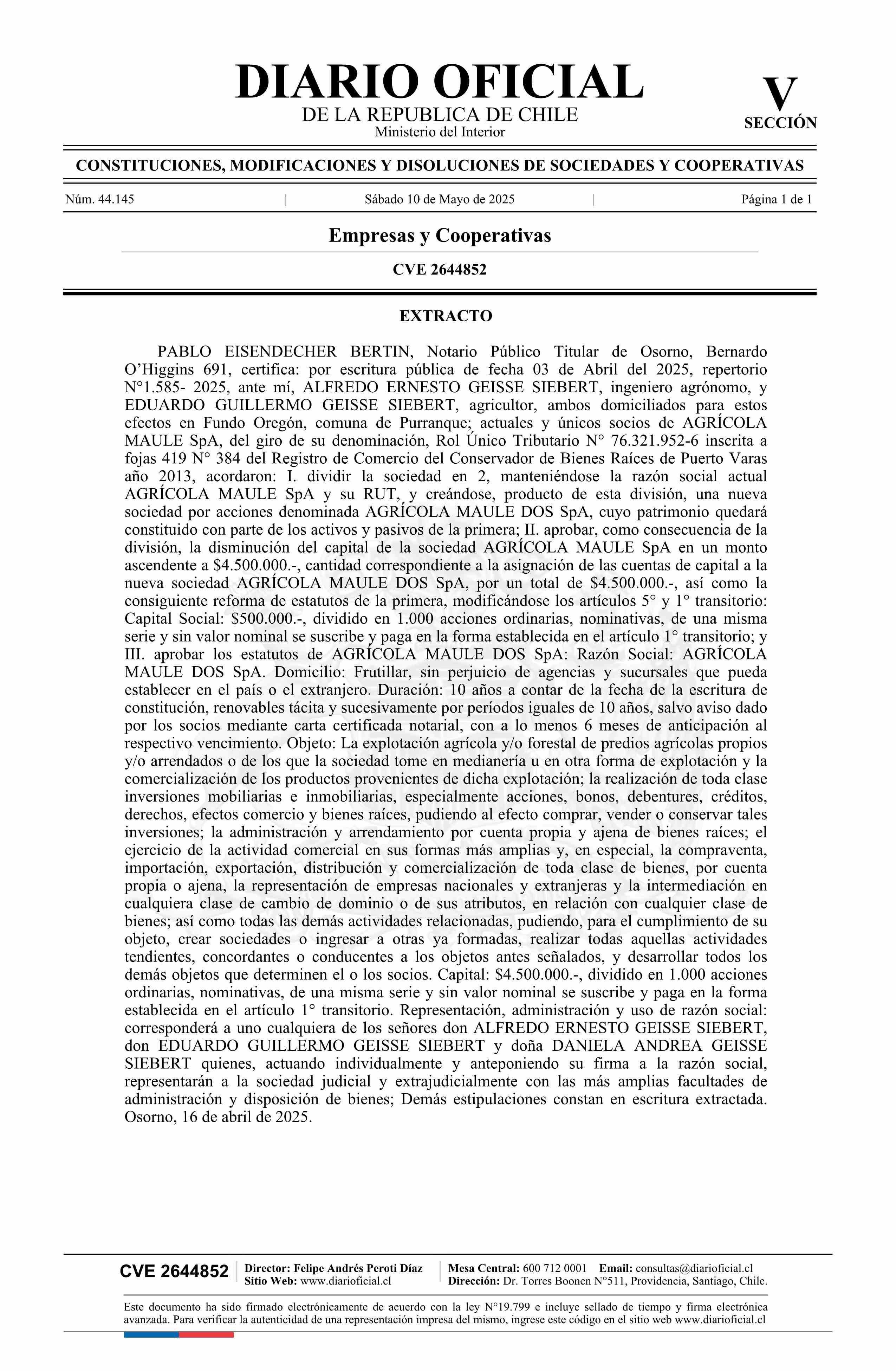 AGRÍCOLA MAULE SpA 76.321.952-6 10-05-2025 Diario Oficial Edición Electrónica |