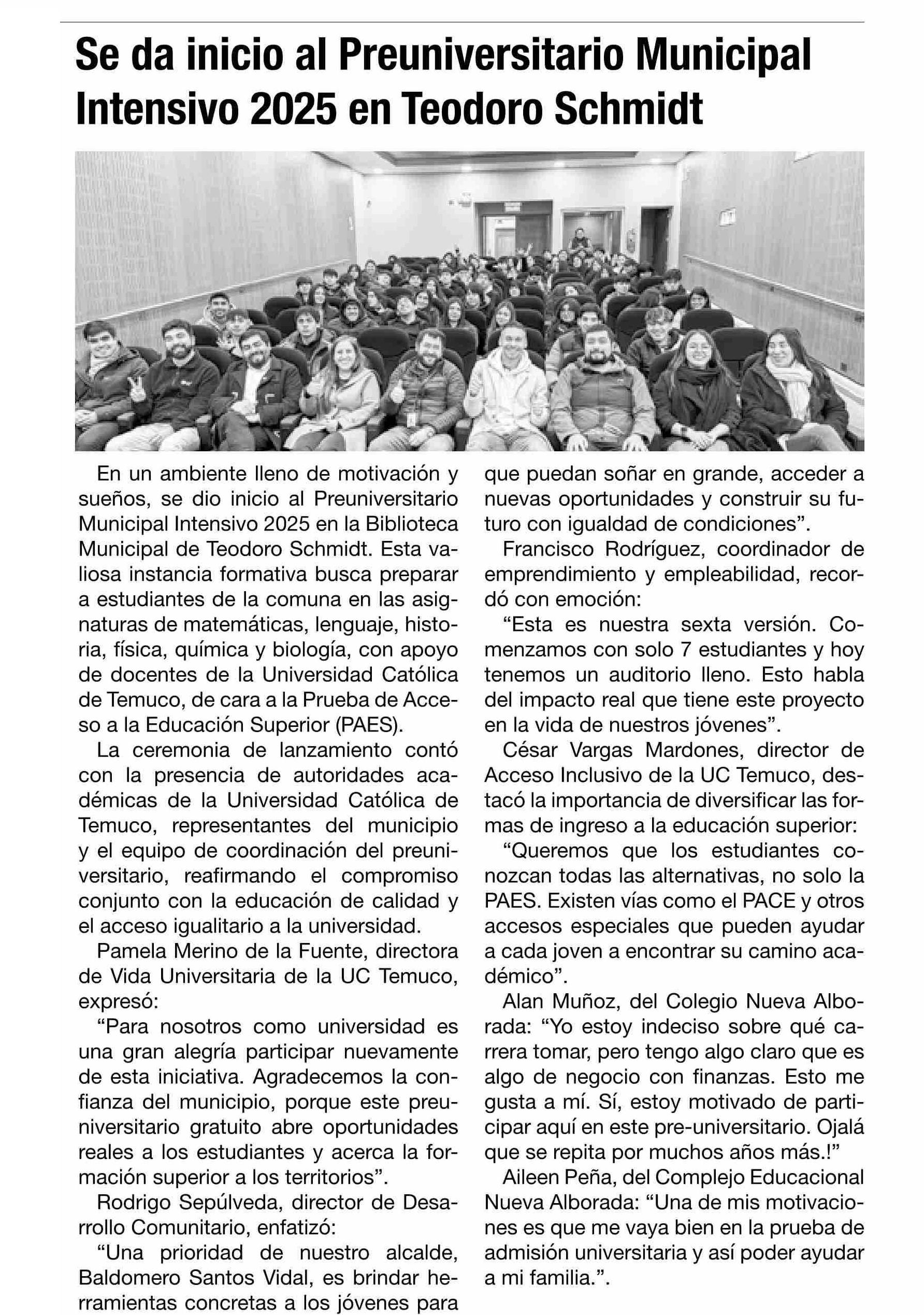 | Título: | Se da inicio al Preuniversitario Municipal Intensivo 2025 en Teodoro Schmidt |
