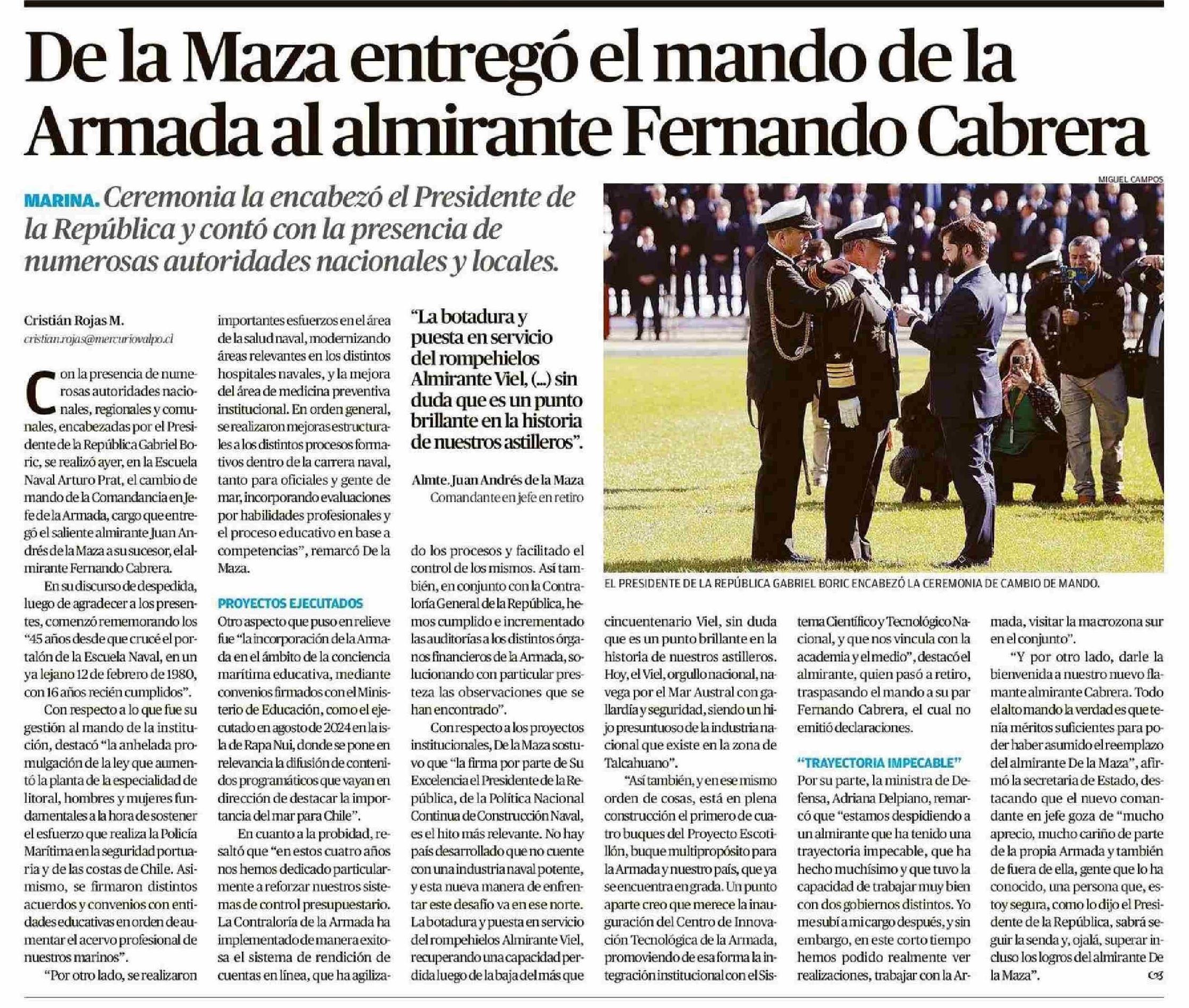 De la Maza entregó el mando de la Armada al almirante Fernando Cabrera 19-06-2025 El Mercurio de Valparaíso |