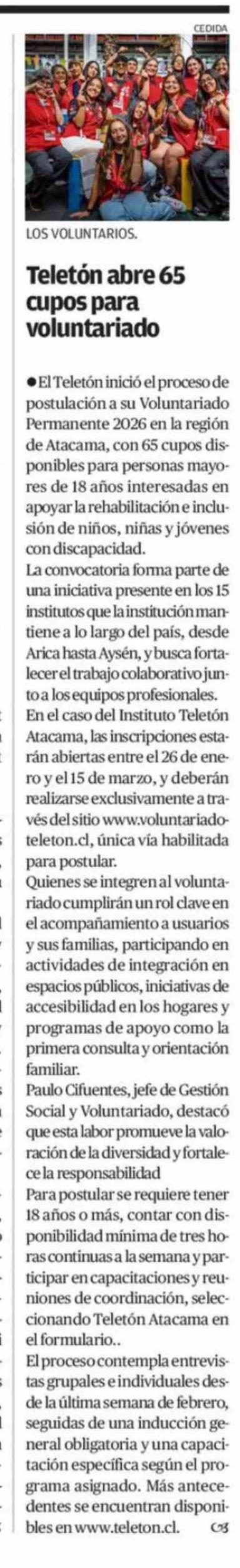 Teletón abre 65 cupos para voluntariado 27-02-2026 El Diario de Atacama |