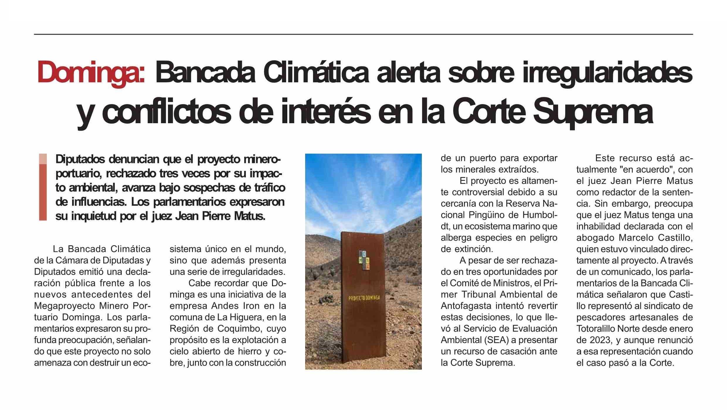 Título: Dominga: Bancada Climática alerta sobre imegularidades y conflictos de interés en la Corte Suprema