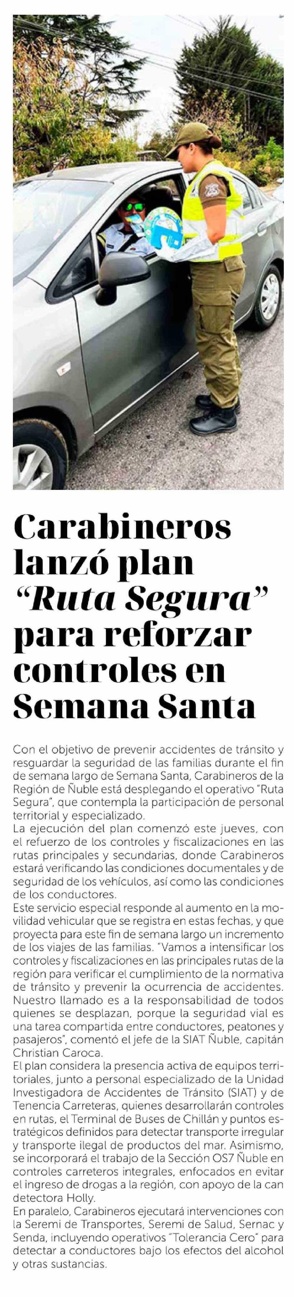 Título: Carabineros lanzó plan "Ruta Segura" para reforzar controles en Semana Santa