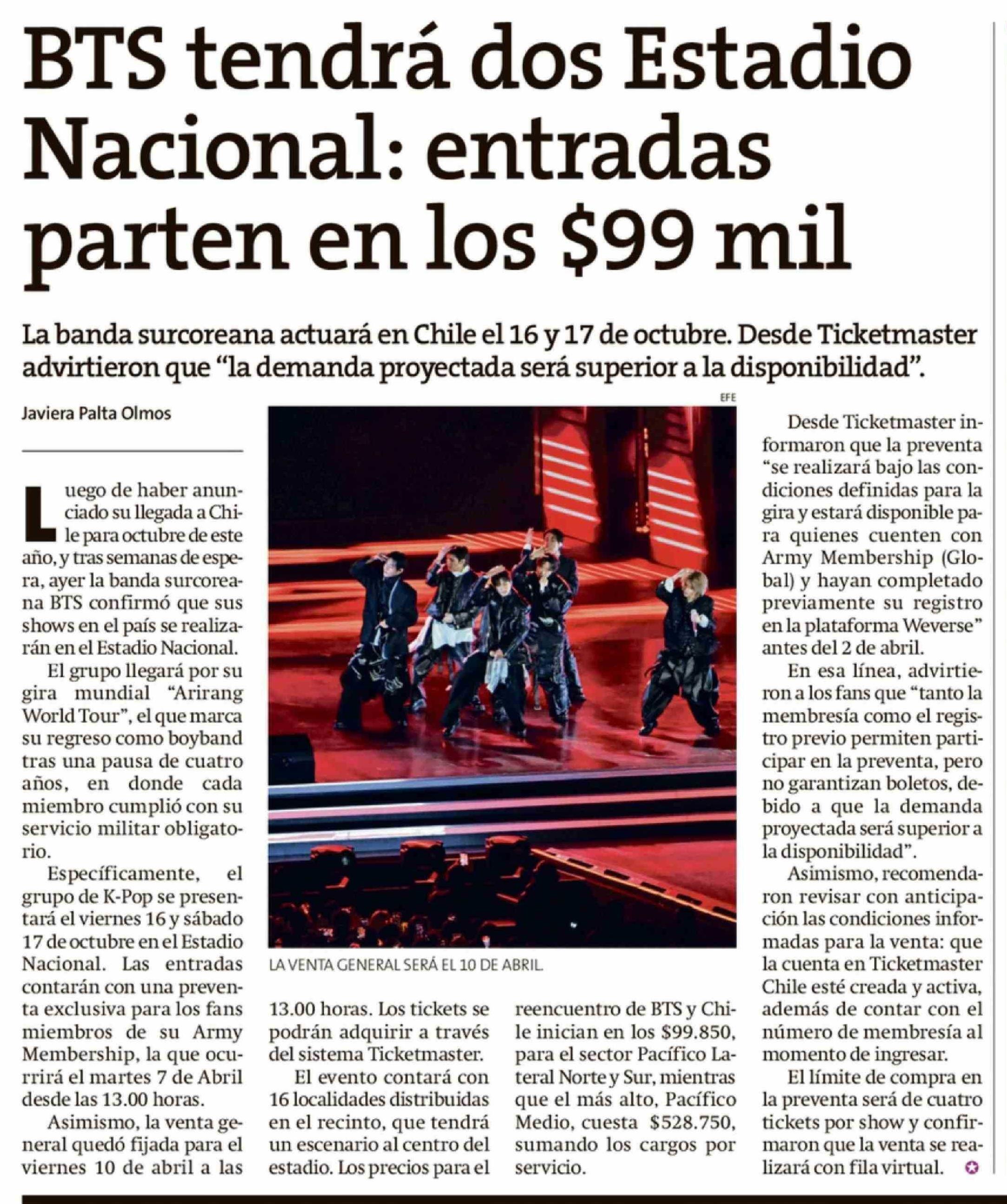 Título: BTS tendrá dos Estadio Nacional: entradas parten en los $99 mil