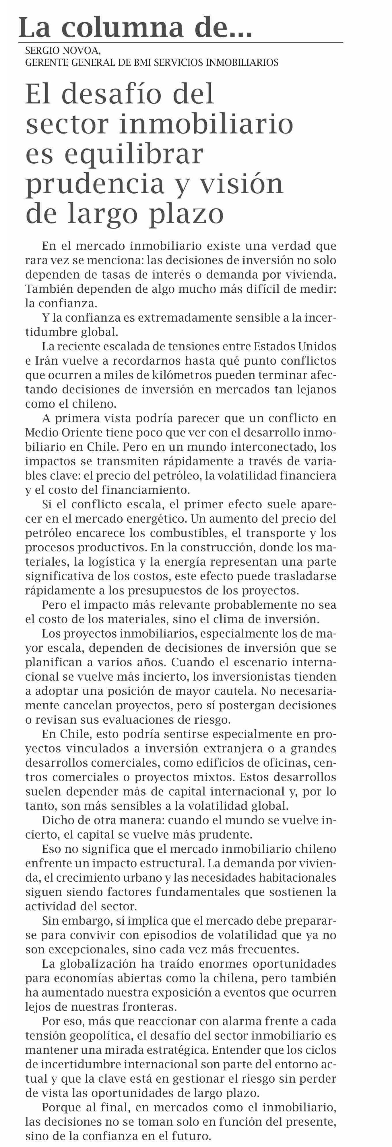 | Título: | COLUMNAS DE OPINIÓN: El desafío del sector inmobiliario es equilibrar prudencia y visión de largo plazo |