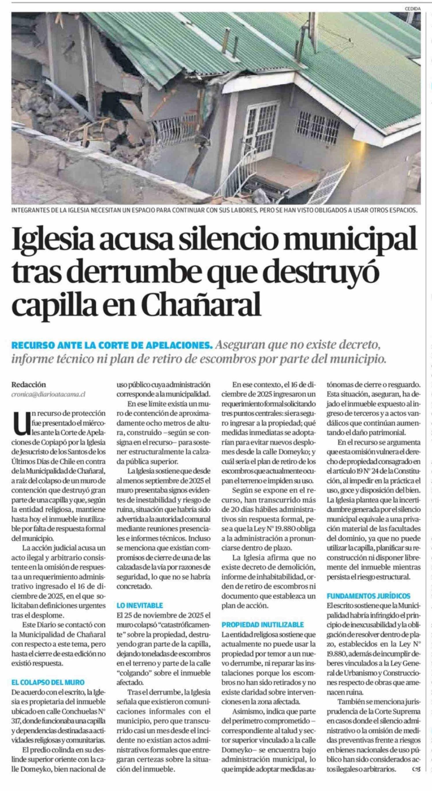 Iglesia acusa silencio municipal tras derrumbe que destruyó capilla en Chañaral 14-02-2026 El Diario de Atacama |