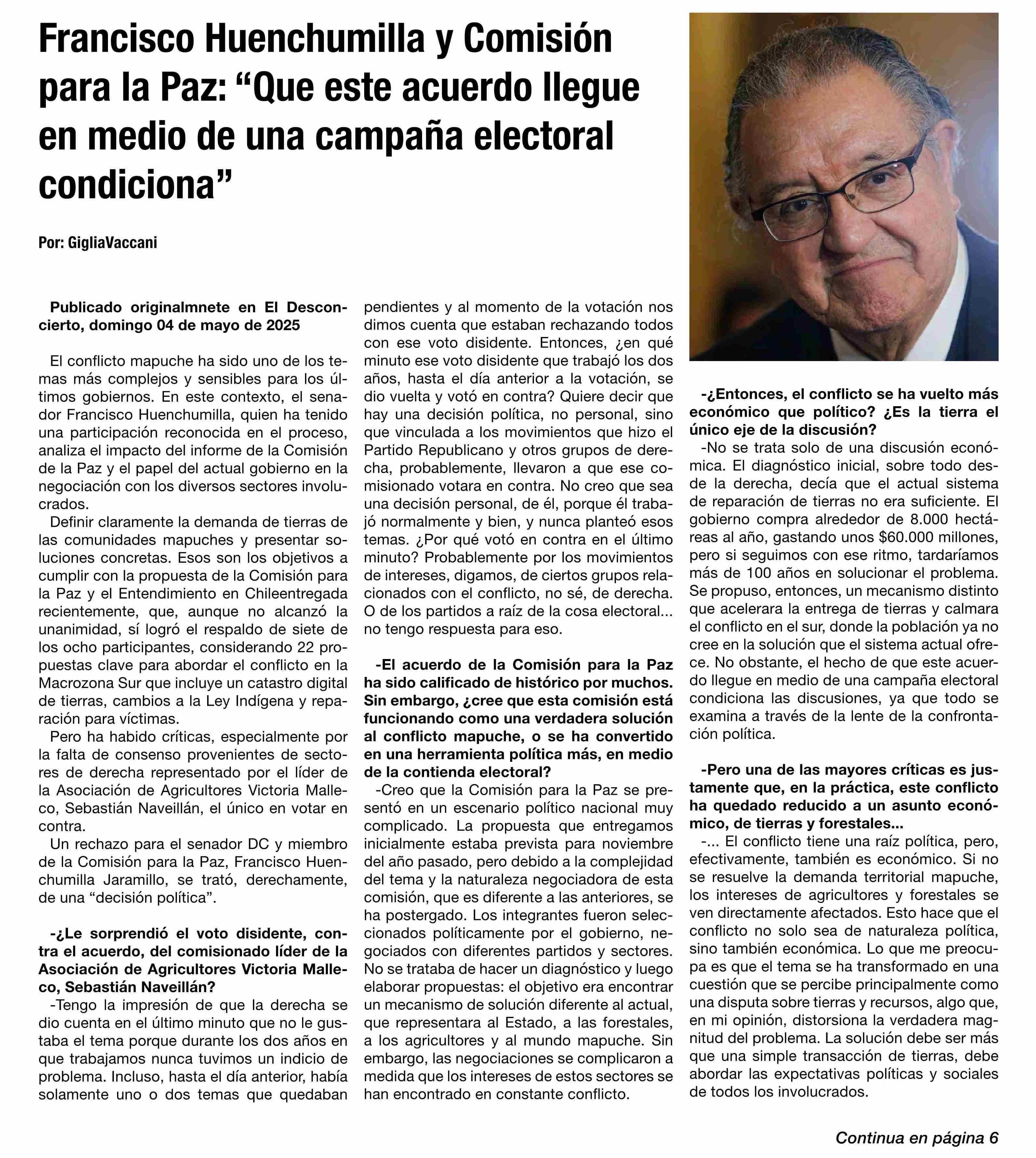 | Título: | Francisco Huenchumilla y Comisión para la Paz: “Que este acuerdo llegue en medio de una campaña electoral condiciona” |