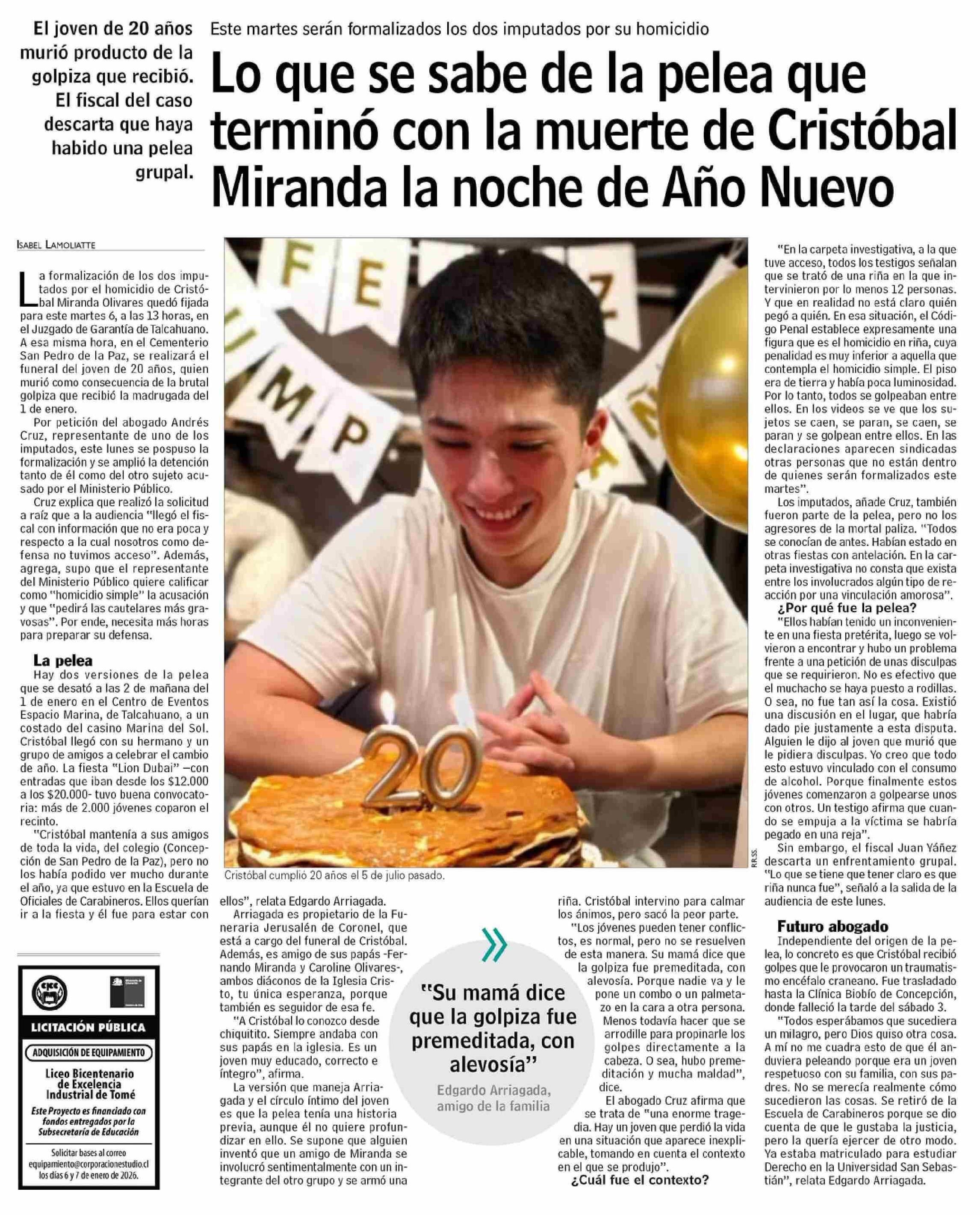 Título: Lo que se sabe de la pelea que terminó con la muerte de Cristóbal Miranda la noche de Año Nuevo