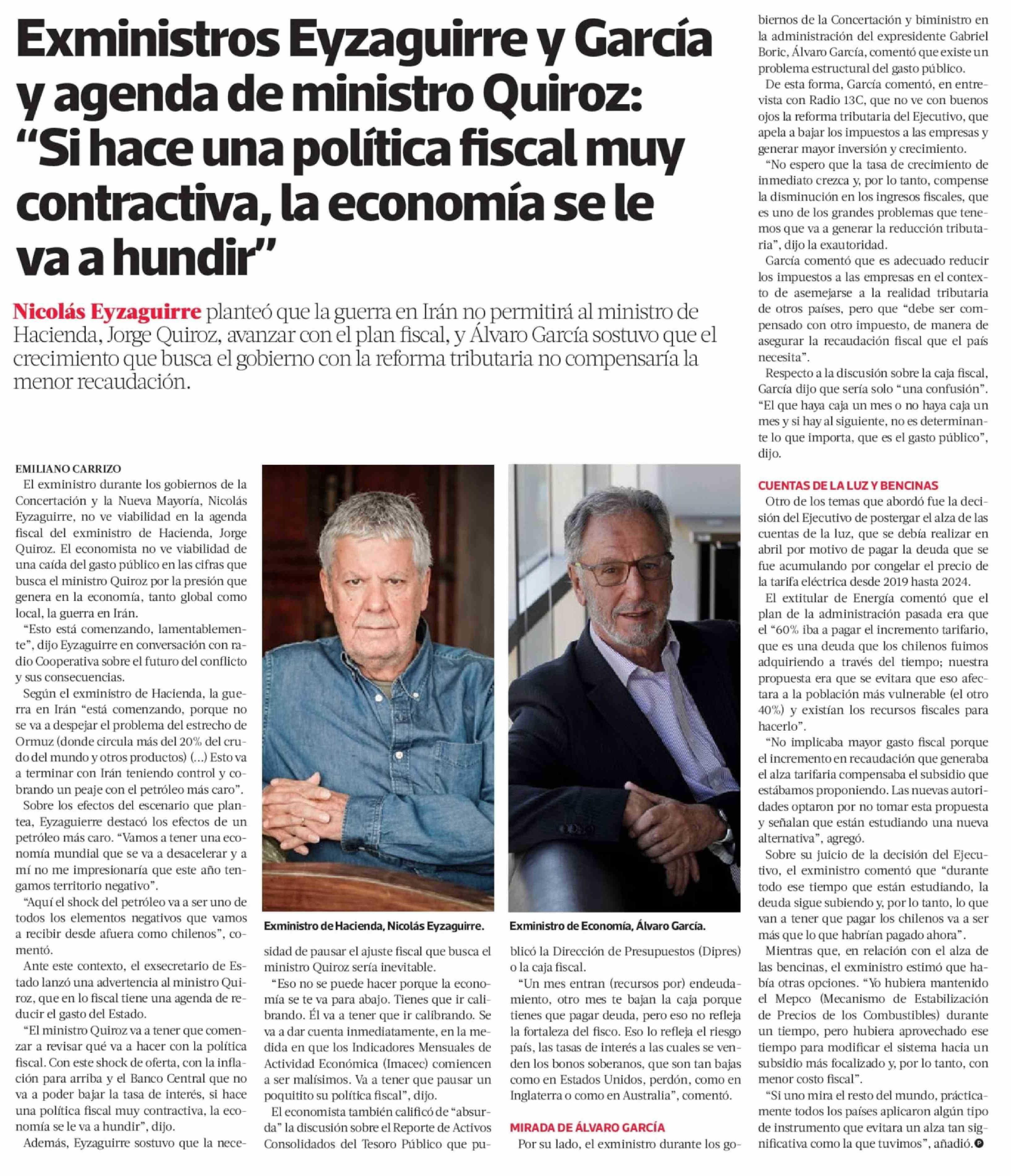 Exministros Eyzaguirre y García y agenda de ministro Quiroz: "Si hace una política fiscal muy contractiva, la economía se le va a hundir" 03-04-2026 La Tercera |