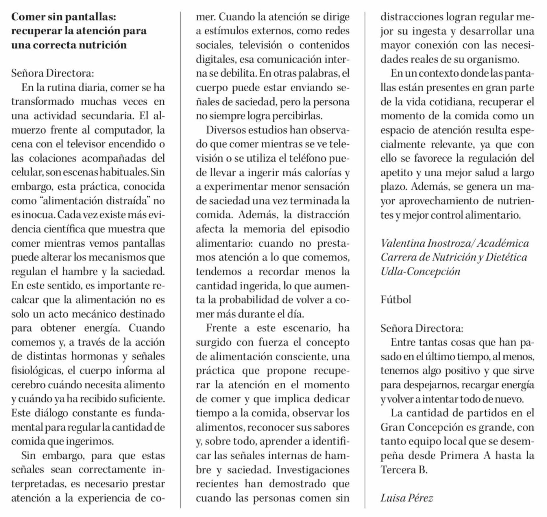 Cartas: Comer sin pantallas: recuperar la atención para una correcta nutrición 13-03-2026 Diario Concepción |