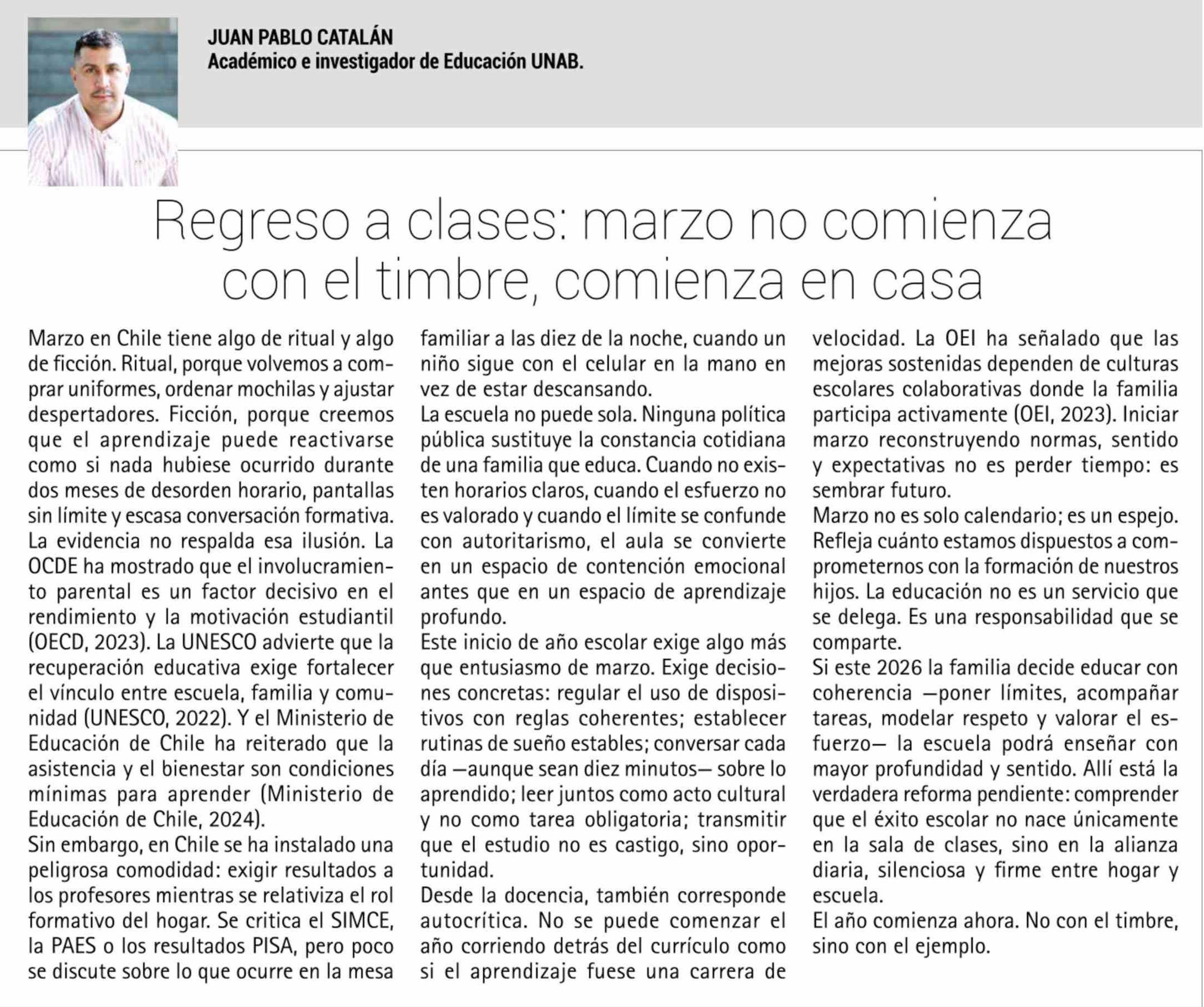 Columnas de Opinión: Regreso a clases: marzo no comienza con el timbre, comienza en casa 27-02-2026 El Rancagüino |
