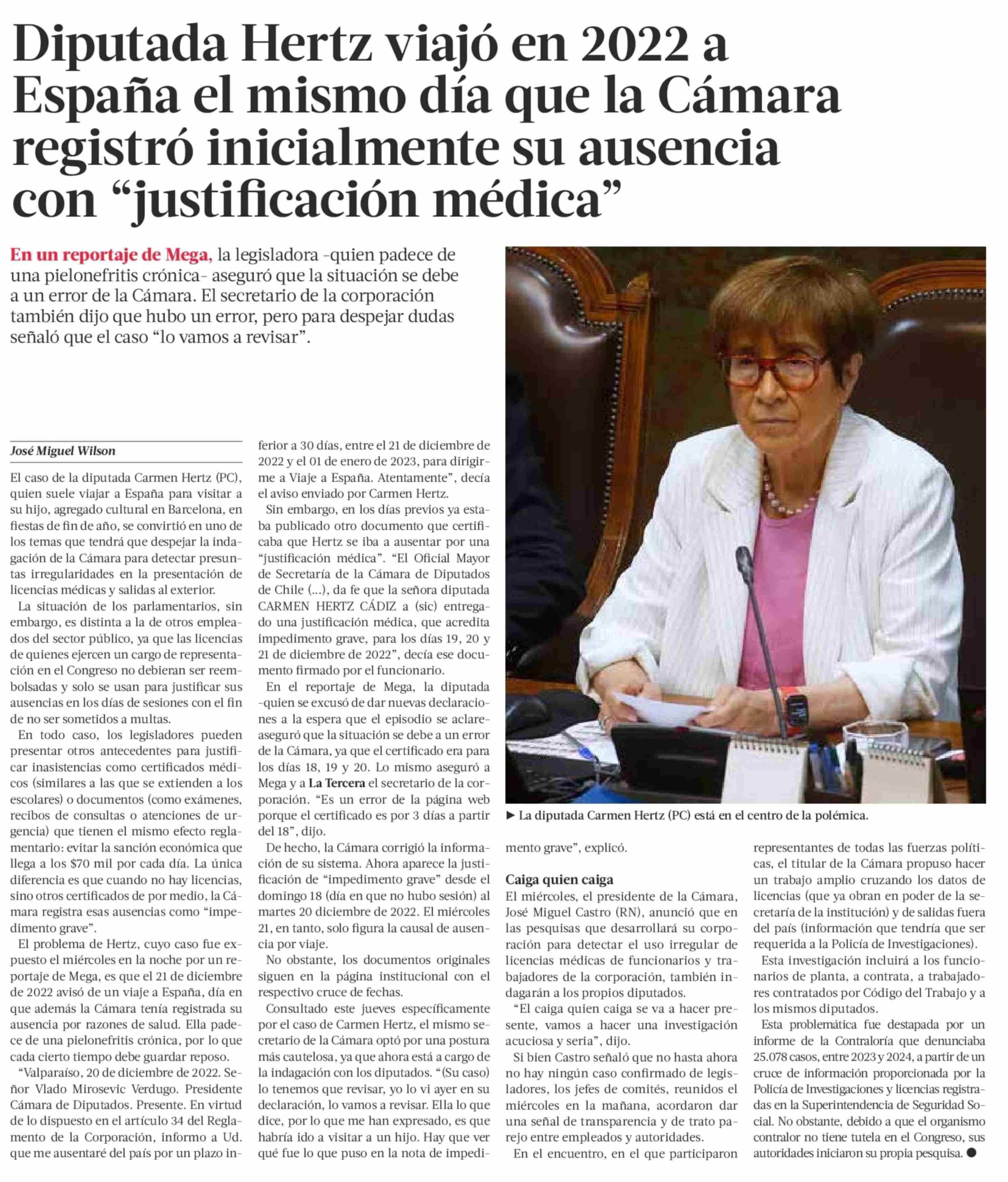 Título: Diputada Hertz viajó en 2022 a España el mismo día que la Cámara registró inicialmente su ausencia con “justificación médica”