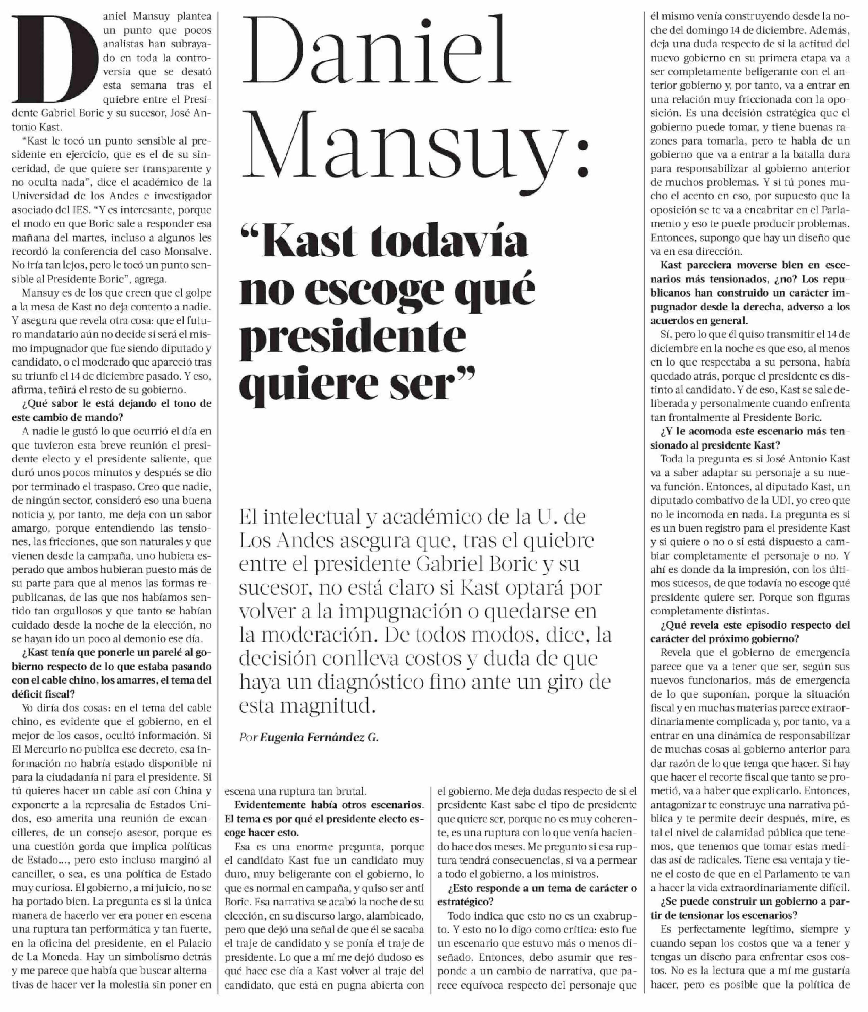 Título: "Kast todavía no escoge qué presidente quiere ser"