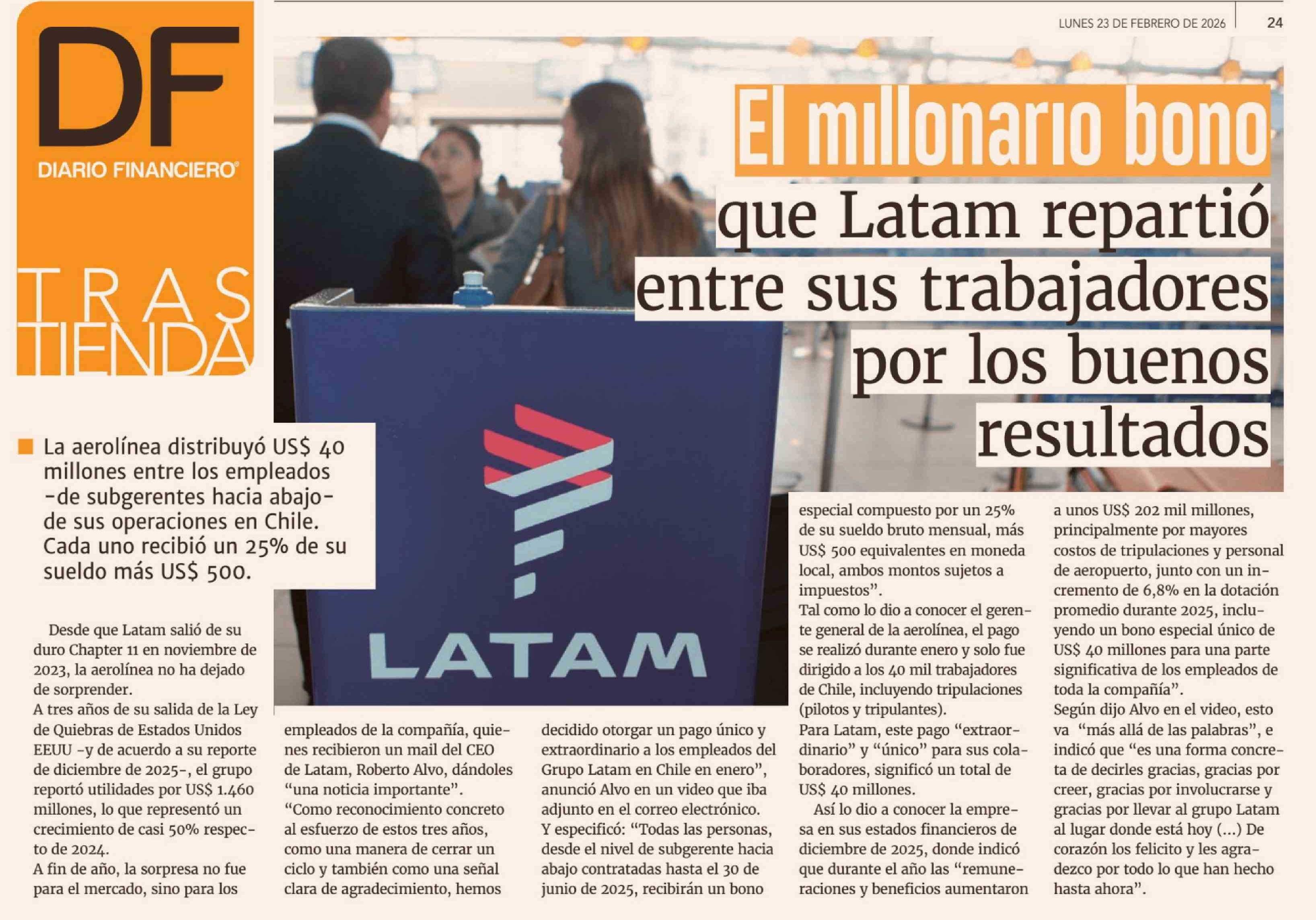 El millonario bono que Latam repartió entre sus trabajadores por los buenos resultados 23-02-2026 Diario Financiero |