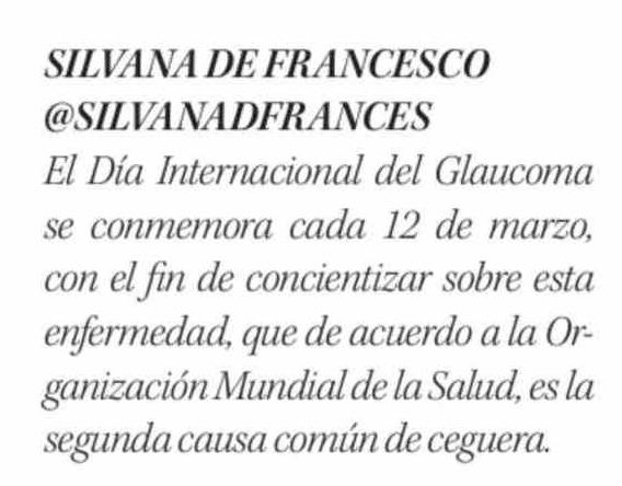 | Título: | SILVANA DE FRANCESCO @SILVANADFRANCES El Día Internacional del Glaucoma se conmemora cada 12 de marzo, con el fin de concientizar sobre esta enfermedad, que de acuerdo a la Organización Mundial de la Salud, es la segunda causa común de ceguera. |