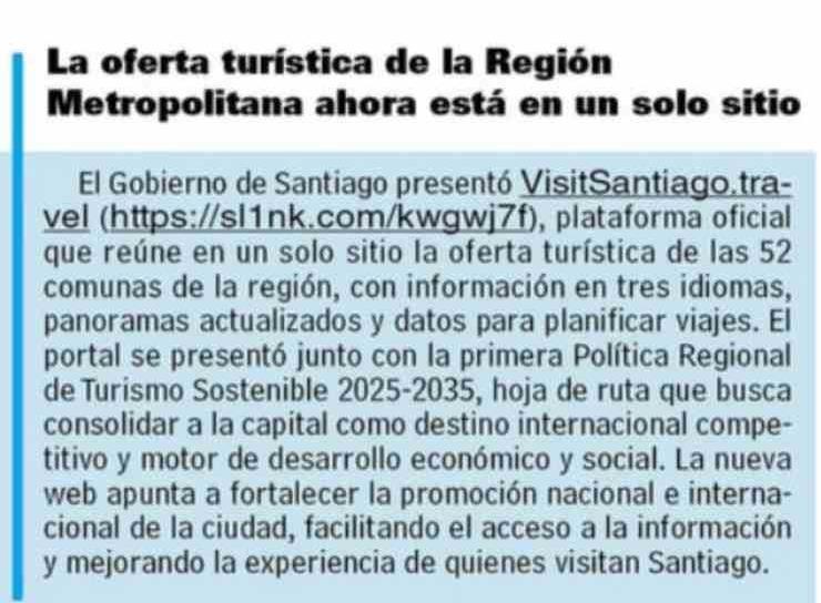 | Título: | La oferta turística de la Región Metropolitana ahora está en un solo sitio El Gobierno de Santiago presentó VisitSantiago.travel (https://sl1nk.com/kwgwj7f), plataforma oficial que reúne en un solo sitio la oferta turística de las 52 comunas de la región, con información en tres idiomas, panoramas a |