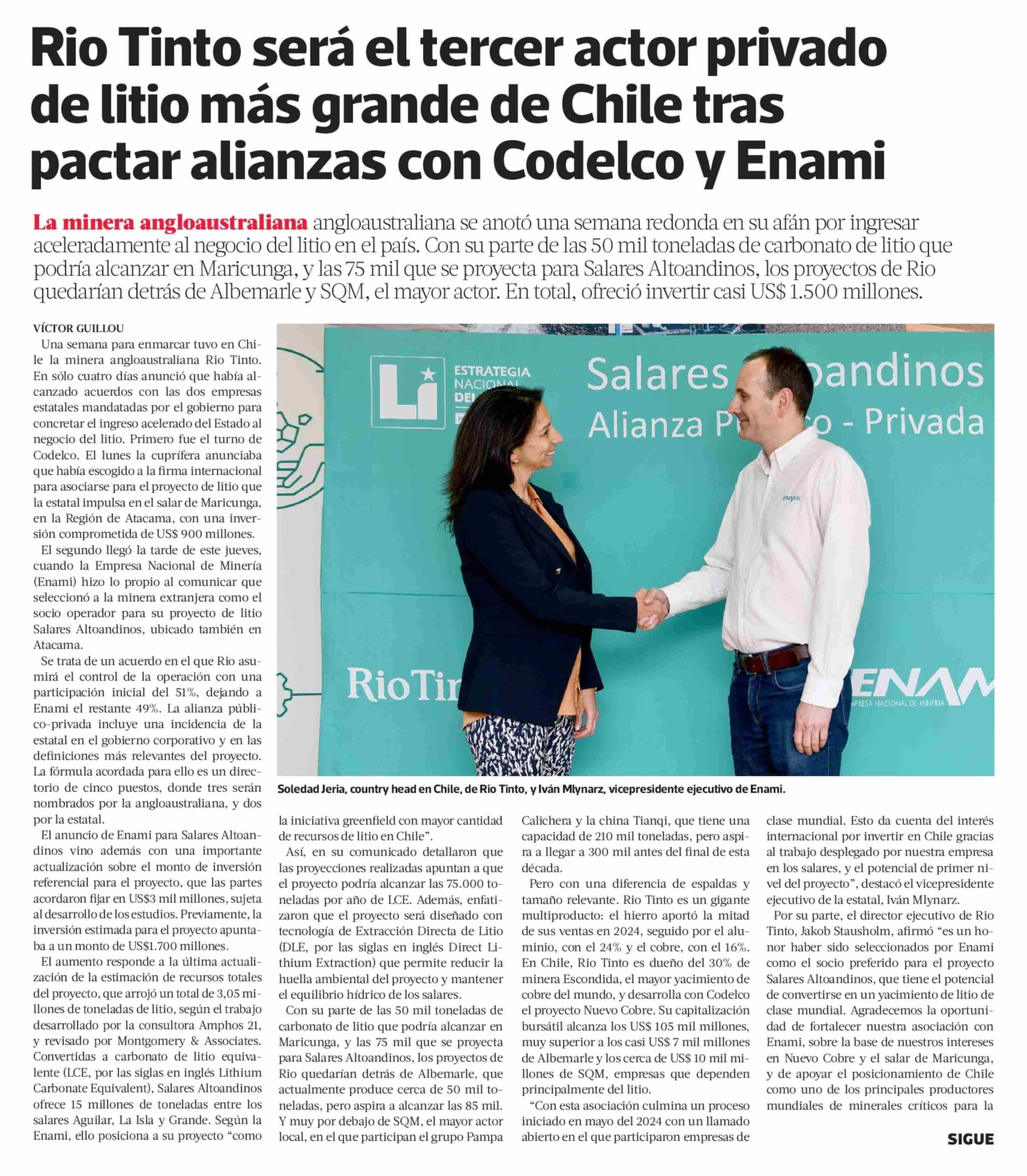 | Título: | Rio Tinto será el tercer actor privado de litio más grande de Chile tras pactar alianzas con Codelco y Enami |