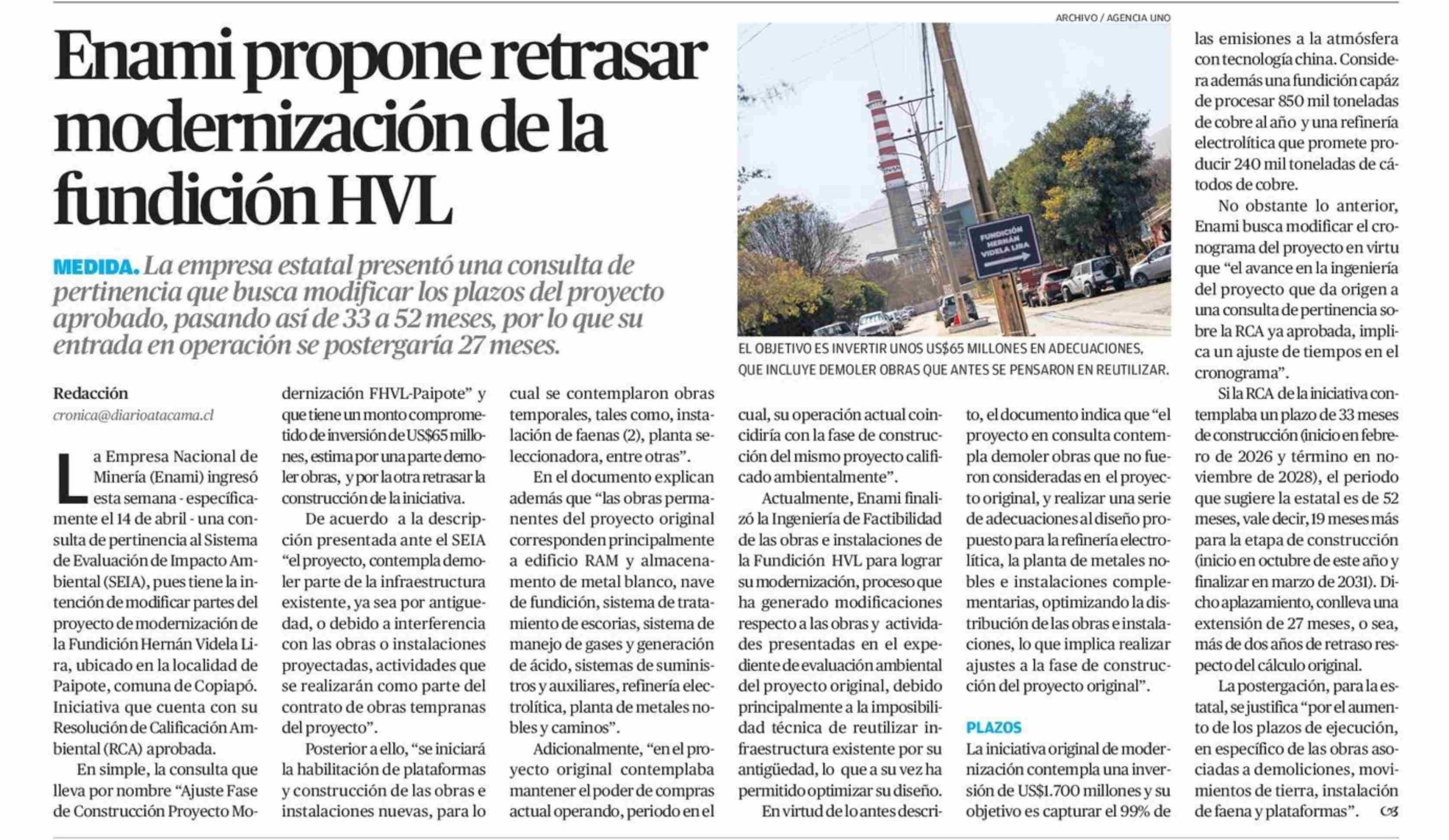 Enami propone retrasar modernización de la fundición HVL 18-04-2026 El Diario de Atacama |