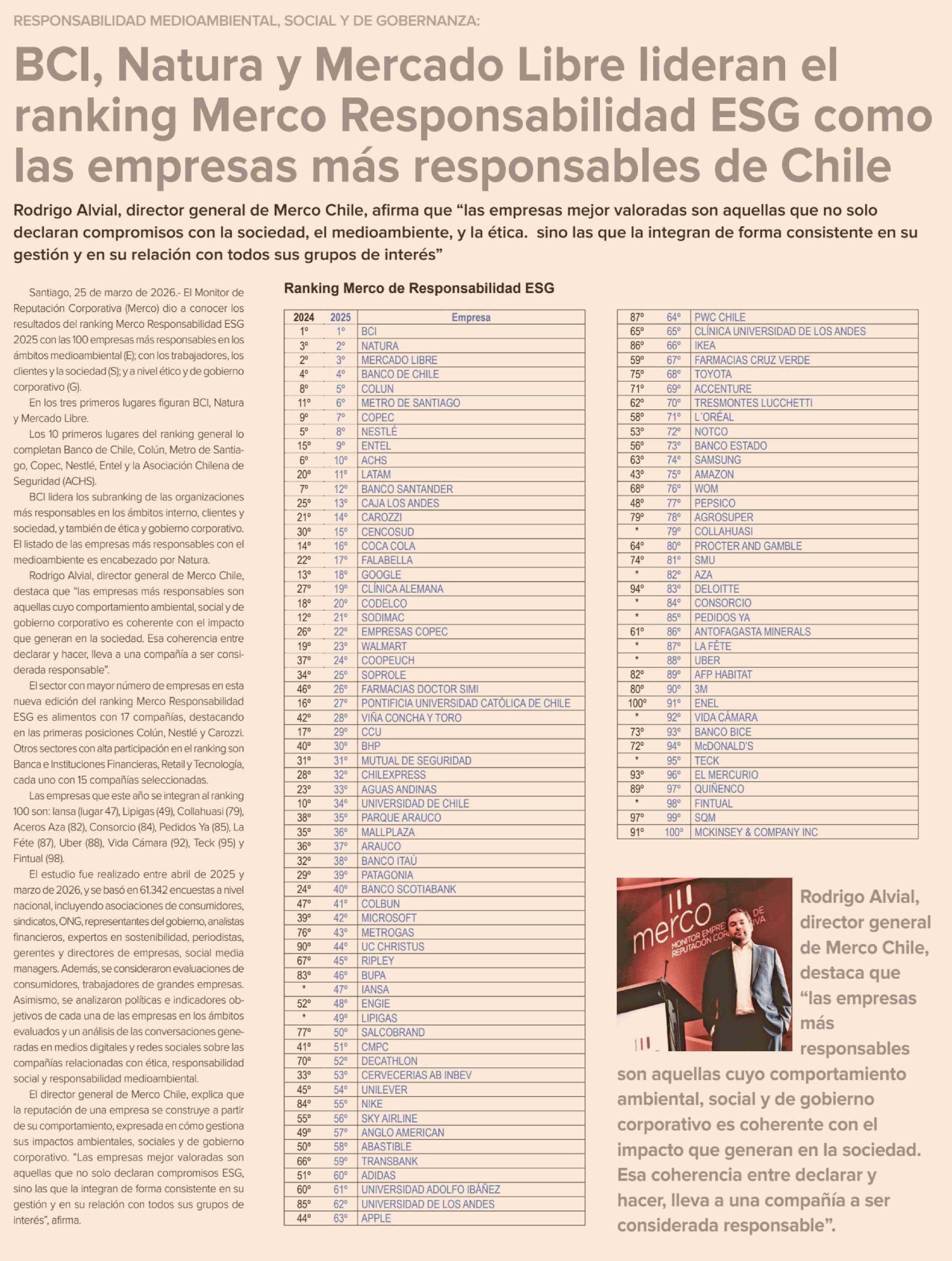 Título: BCI, Natura y Mercado Libre lideran el ranking Merco Responsabilidad ESG como las empresas más responsables de Chile