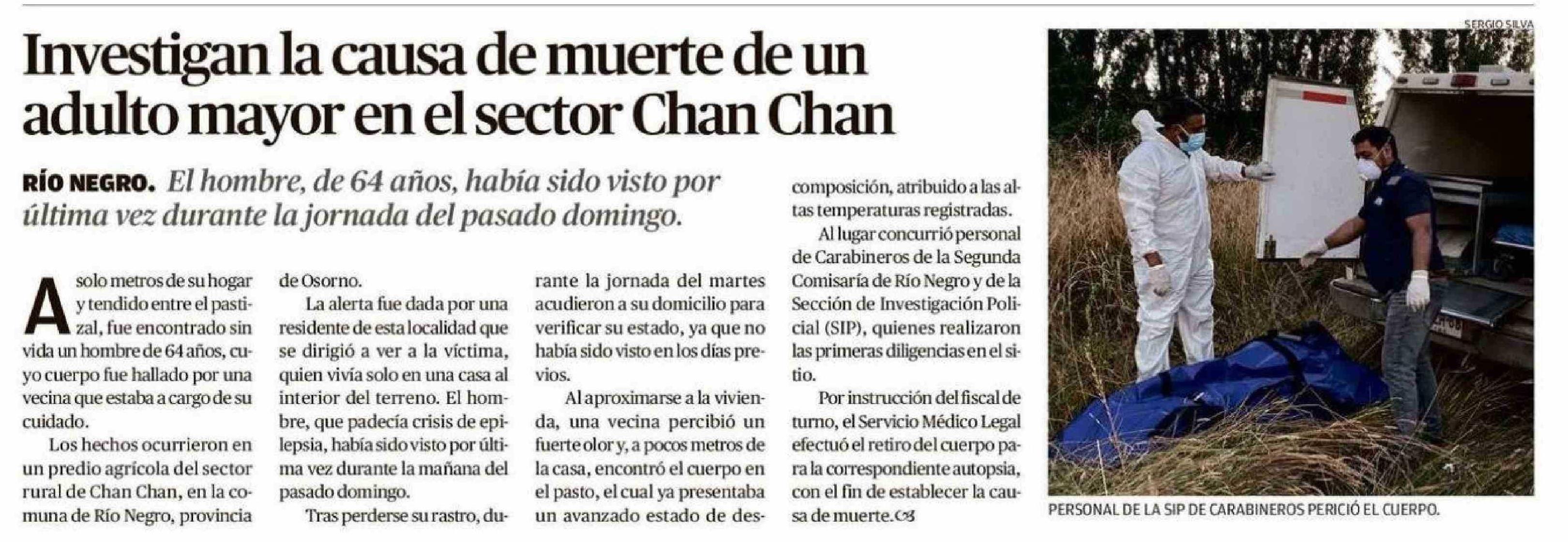 Investigan la causa de muerte de un adulto mayor en el sector Chan Chan 09-01-2026 El Austral de Osorno |