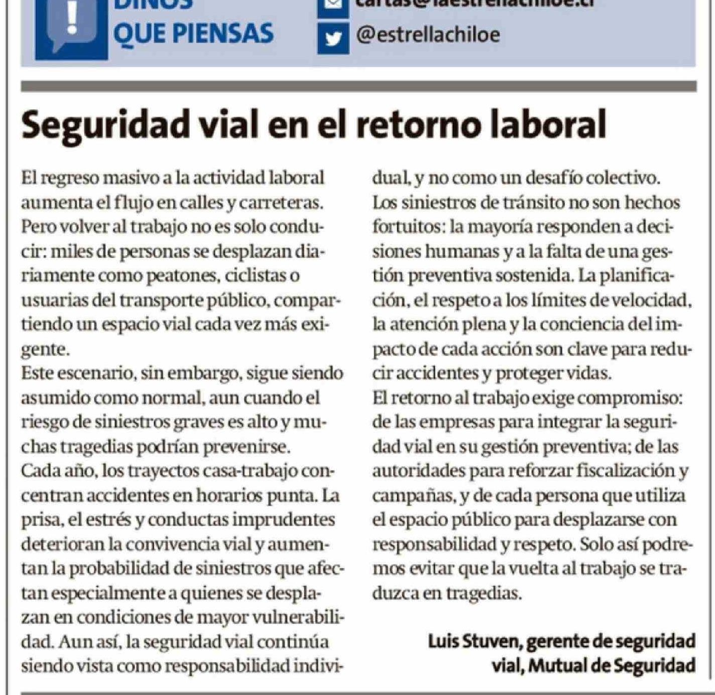 Título: Columnas de Opinión: Seguridad vial en el retorno laboral