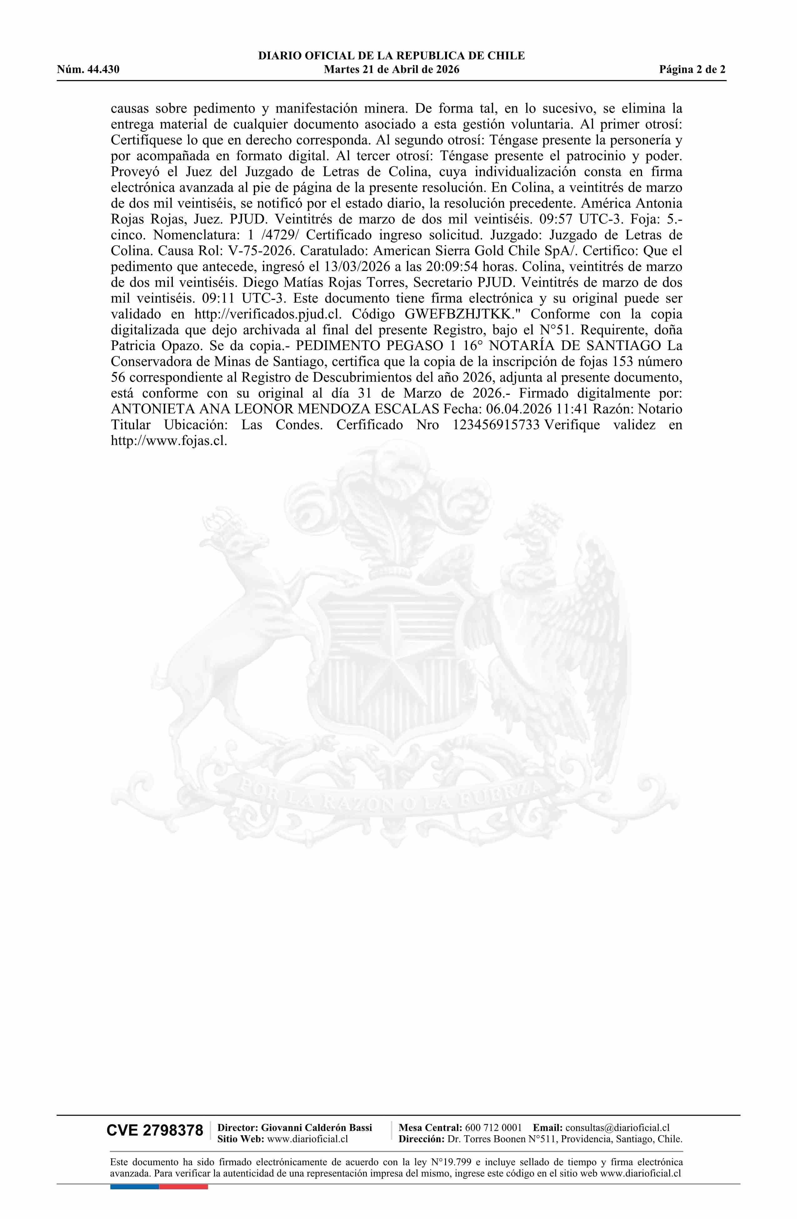 PEGASO 1 / American Sierra Gold Chile SpA 21-04-2026 DIARIO OFICIAL CHILE - BOLETÍN OFICIAL DE MINERÍA |