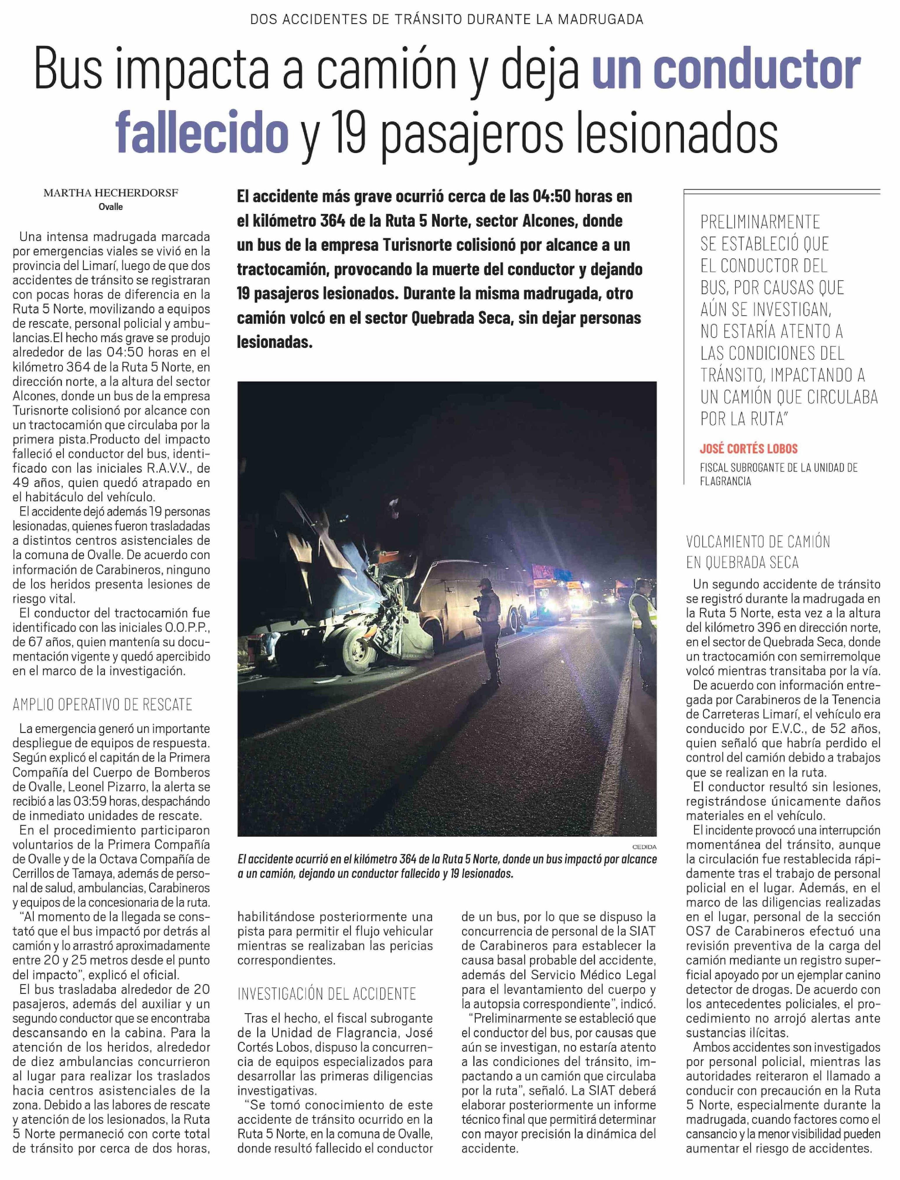 Bus impacta a camión y deja un conductor fallecido y 19 pasajeros lesionados 06-03-2026 El Ovallino |