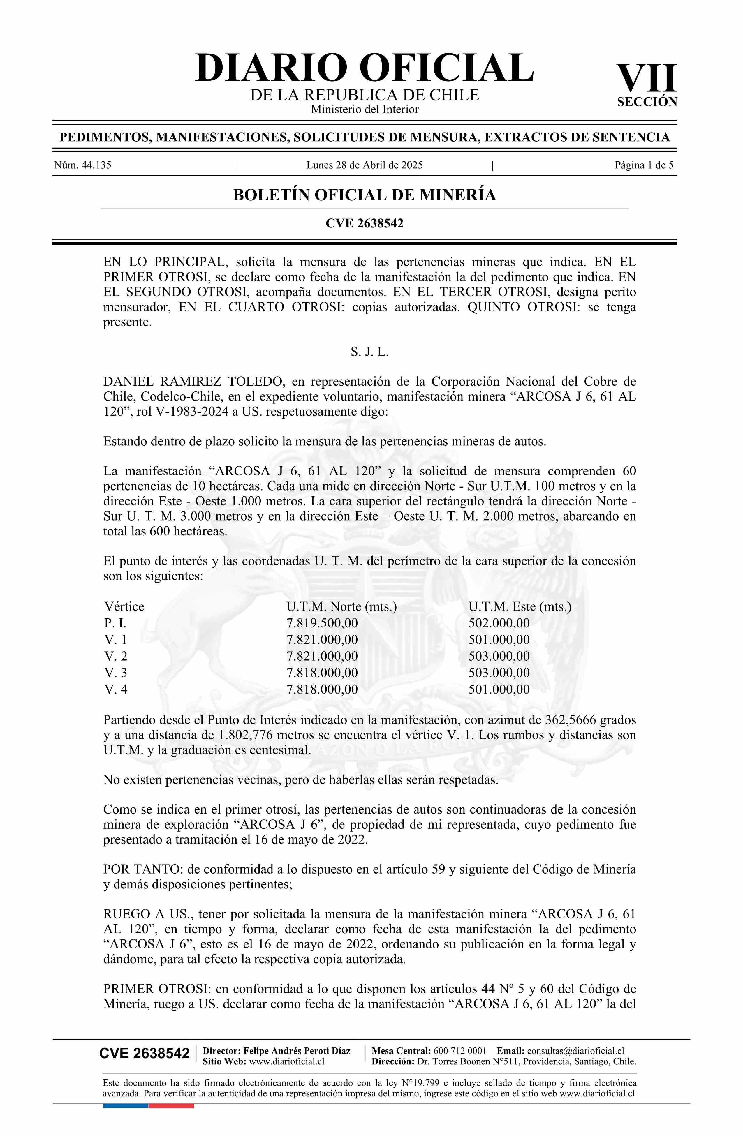 ARCOSA J 6, 61 AL 120 / Corporación Nacional del Cobre de Chile 28-04-2025 DIARIO OFICIAL CHILE - BOLETÍN OFICIAL DE MINERÍA |
