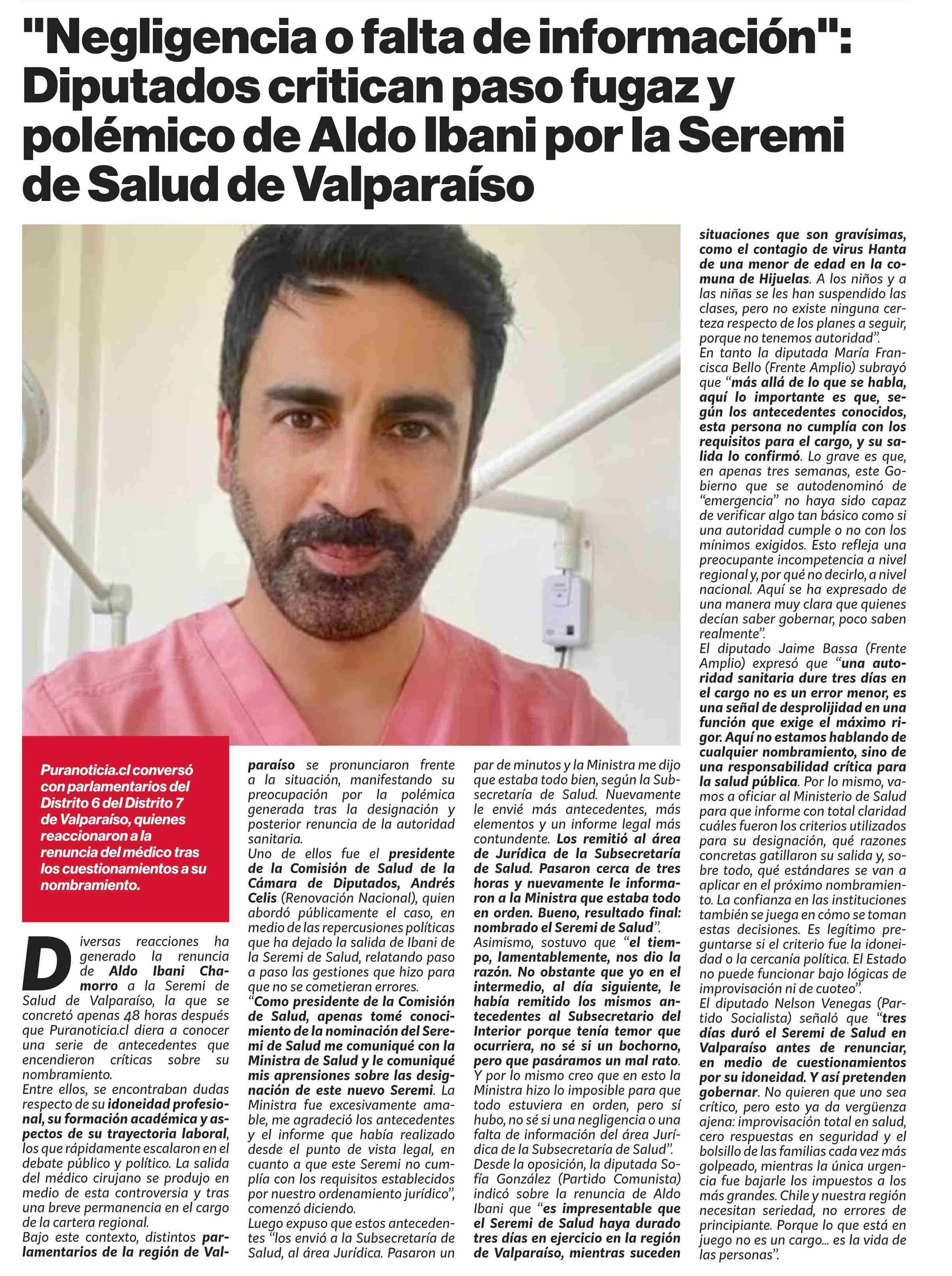 "Negligencia o falta de información": Diputados critican paso fugaz y polémico de Aldo Ibani por la Seremi de Salud de Valparaiso 06-04-2026 Puranoticia.cl |