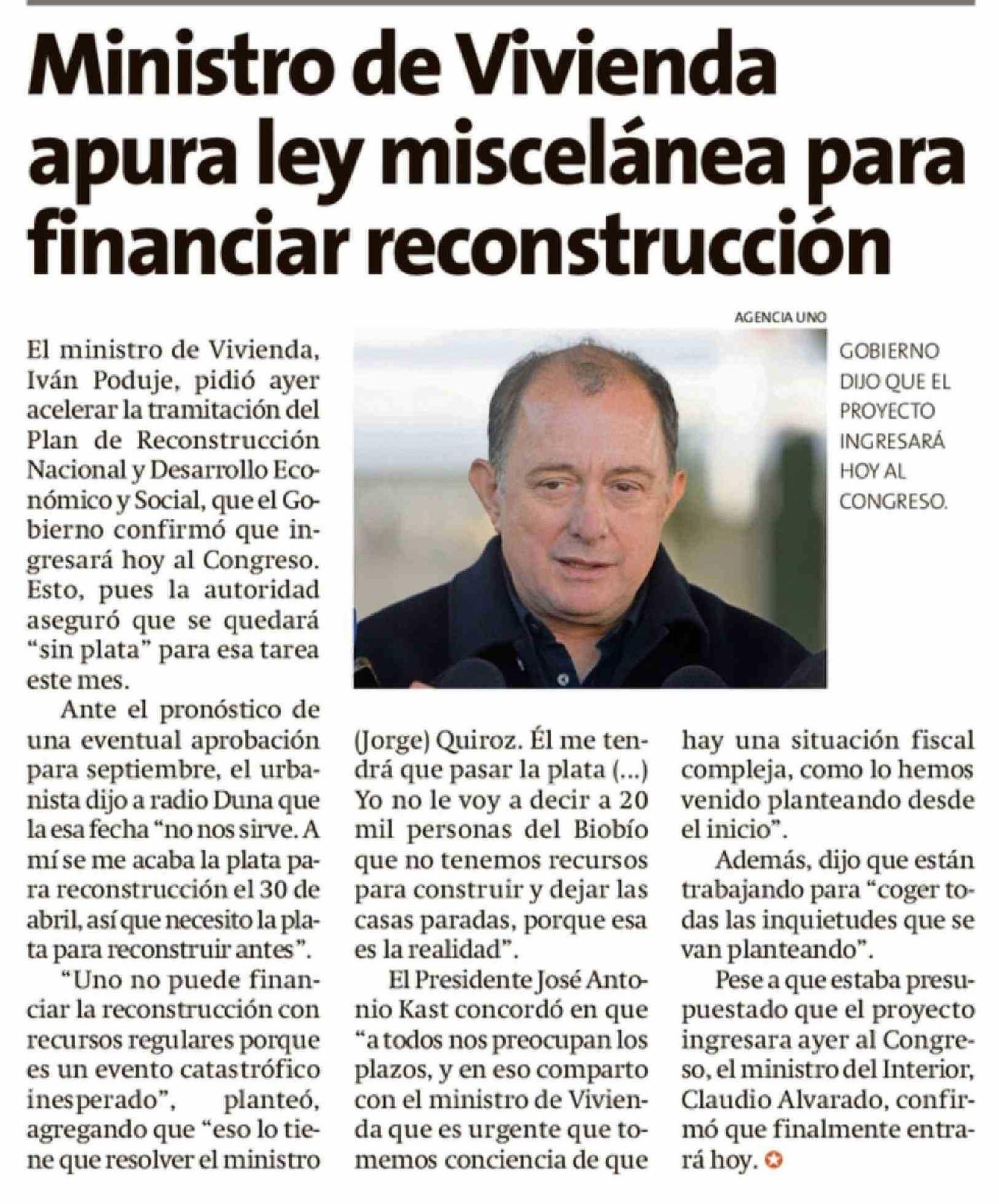 | Título: | Ministro de Vivienda apura ley miscelánea para financiar reconstrucción |