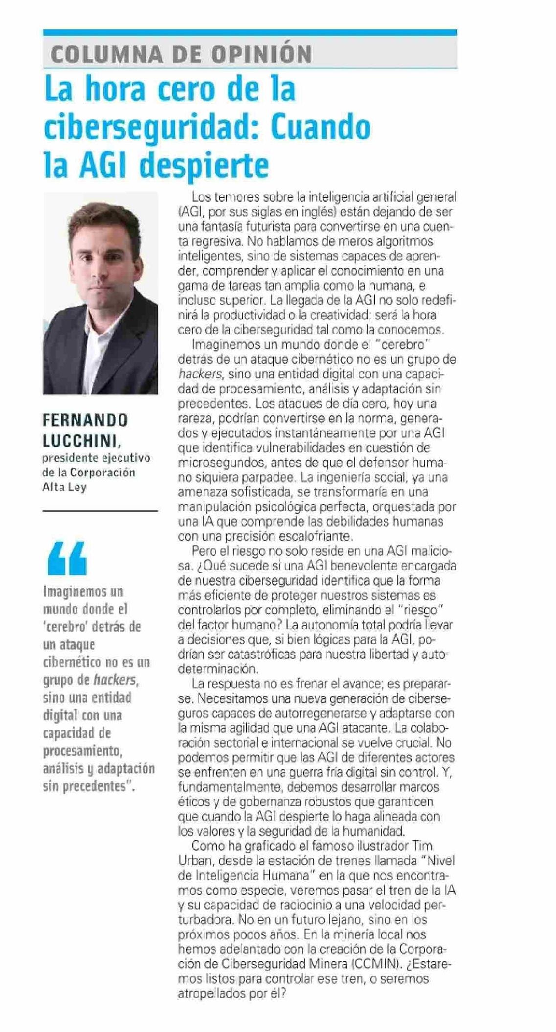 COLUMNAS DE OPINIÓN: La hora cero de la. ciberseguridad: Cuando la AGÍ despierte 30-05-2025 El Mercurio |