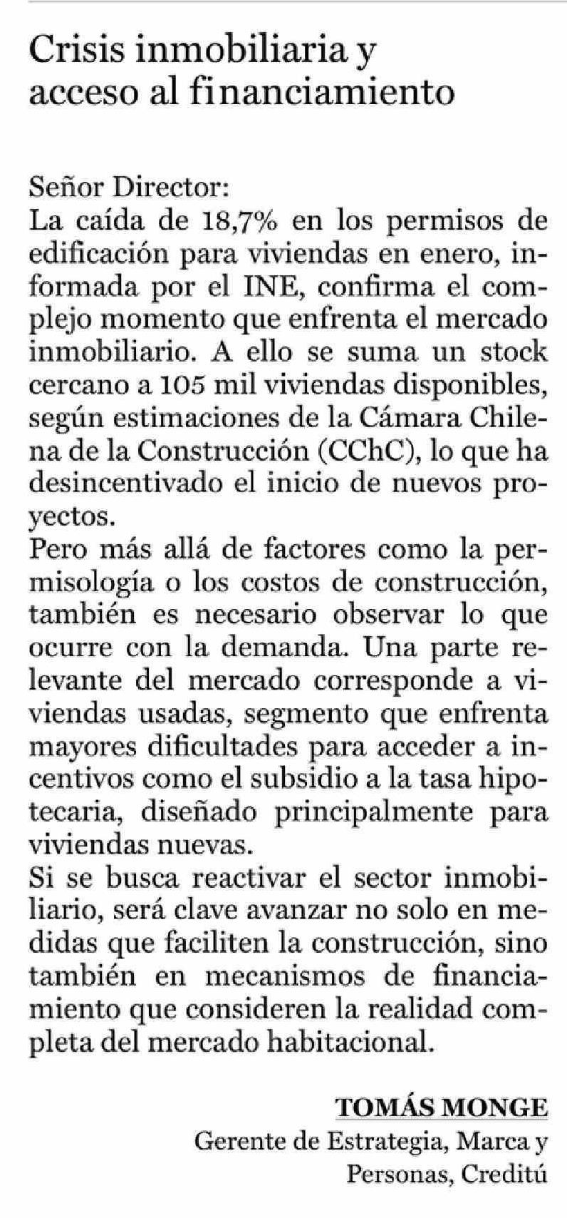 Cartas: Crisis inmobiliaria y acceso al financiamiento 18-03-2026 La Prensa de Curicó |