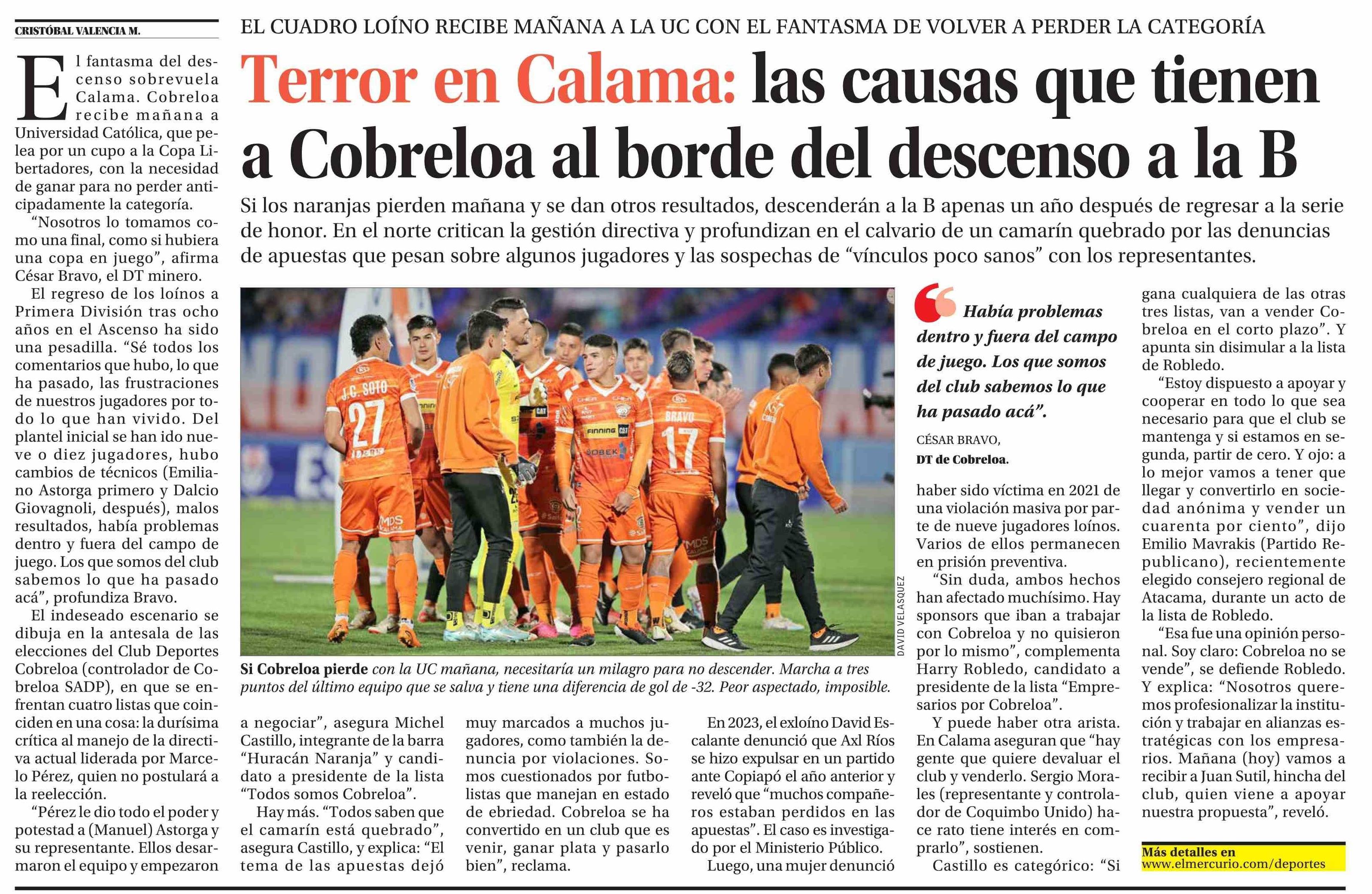 Terror en Calama: las causas que tienen a Cobreloa al borde del descenso a la B 01-11-2024 El Mercurio |