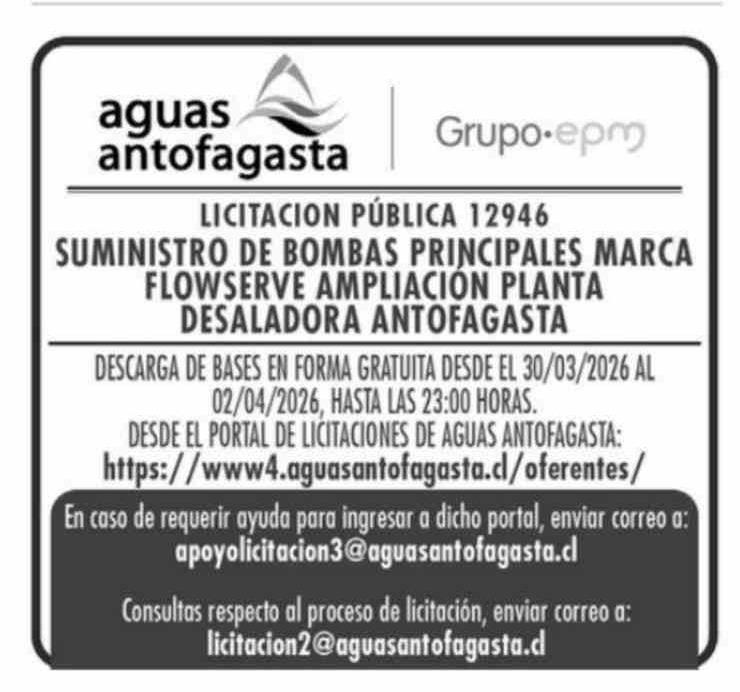 Título: Aviso Licitaciones: aguas antofagasta Grupo.epm LICITACION PÚBLICA 12946 SUMINISTRO DE BOMBAS PRINCIPALES MARCA FLOWSERVE AMPLIACIÓN PLANTA DESALADORA ANTOFAGASTA DESCARGA DE BASES EN FORMA GRATUITA DESDE EL 30/03/2026 AL 02/04/2026, HASTA LAS 23:00 HORAS. DESDE EL PORTAL DE LICITACIONES DE AGUAS AN