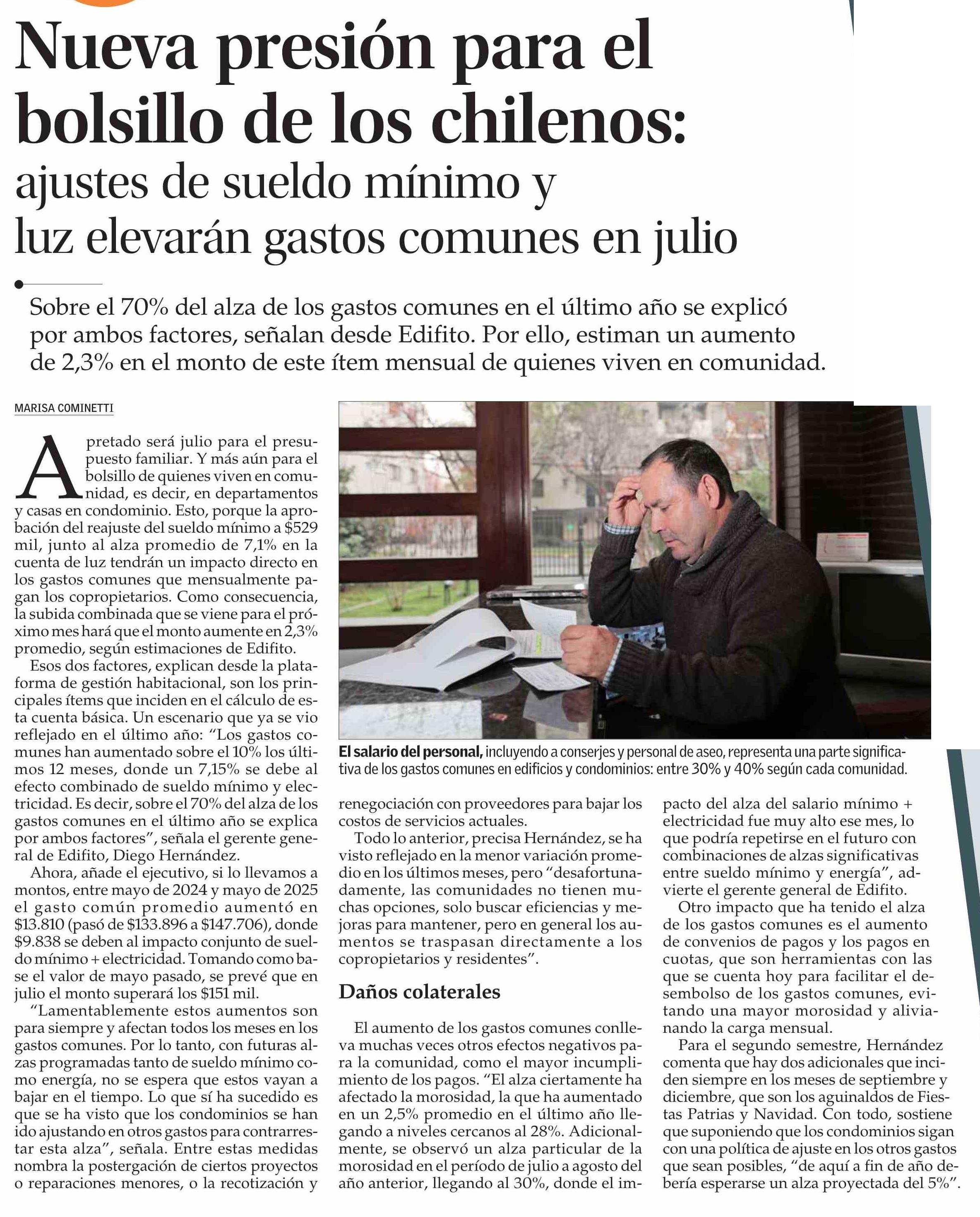 Nueva presión para el bolsillo de los chilenos: ajustes de sueldo mínimo y luz elevarán gastos comunes en julio 23-06-2025 El Mercurio |