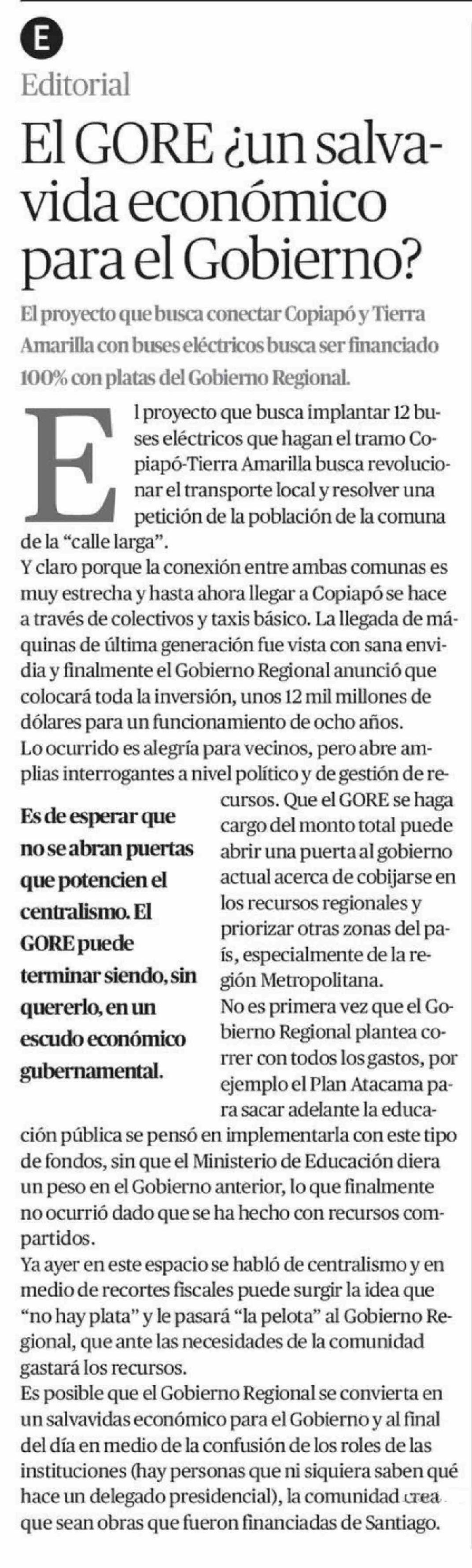 Editorial: El GORE ¿un salvavida económico para el Gobierno? 22-04-2026 El Diario de Atacama |