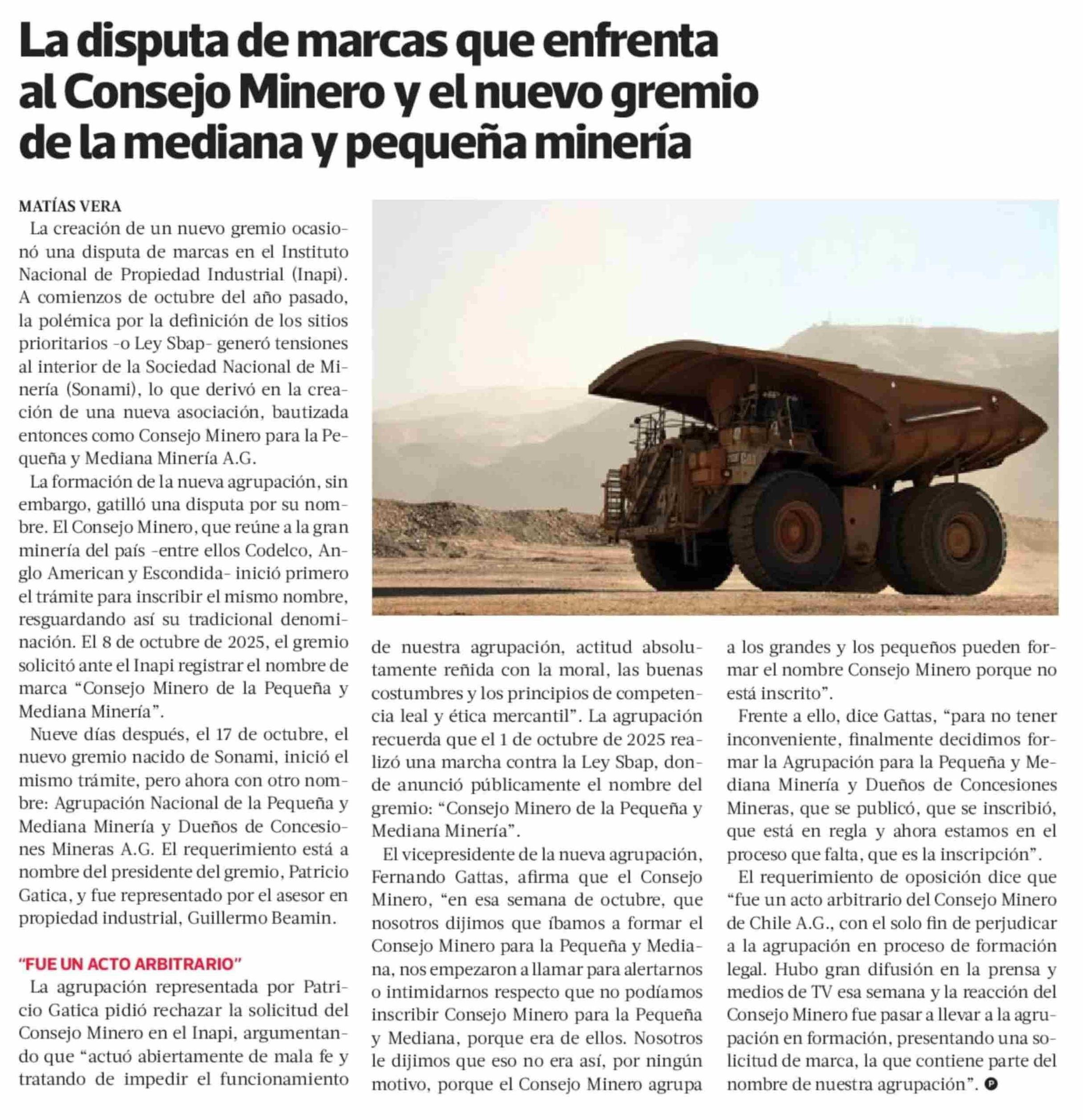 La disputa de marcas que enfrenta al Consejo Minero y el nuevo gremio de la mediana y pequeña minería 09-01-2026 La Tercera |