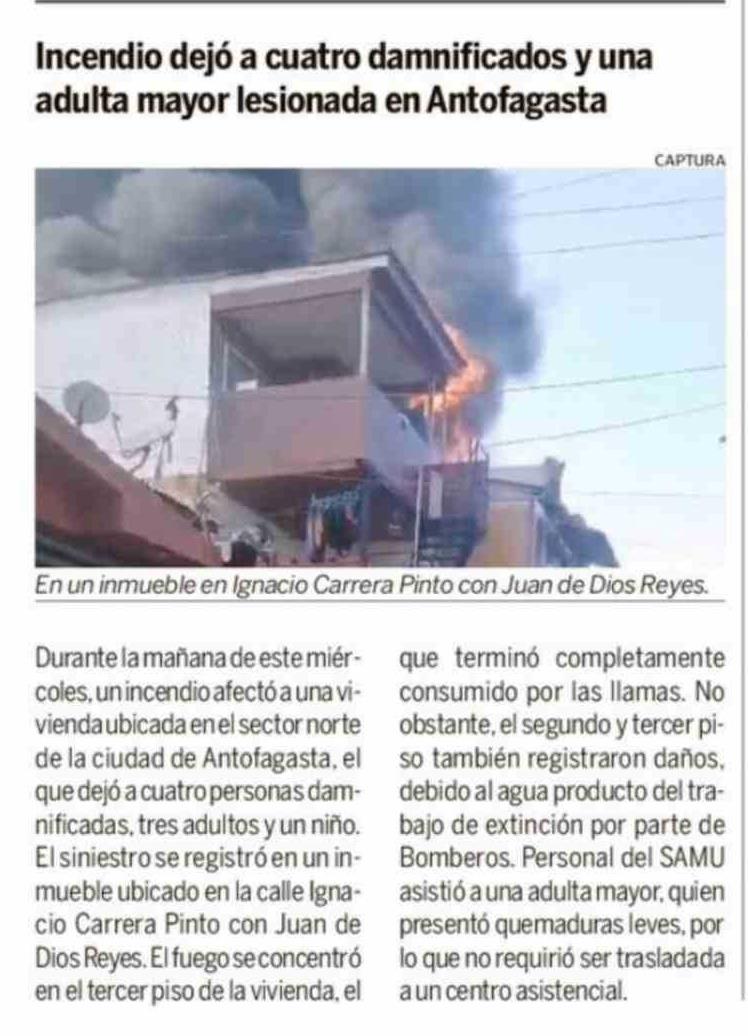 Título: Incendio dejó a cuatro damnificados y una adulta mayor lesionada en Antofagasta