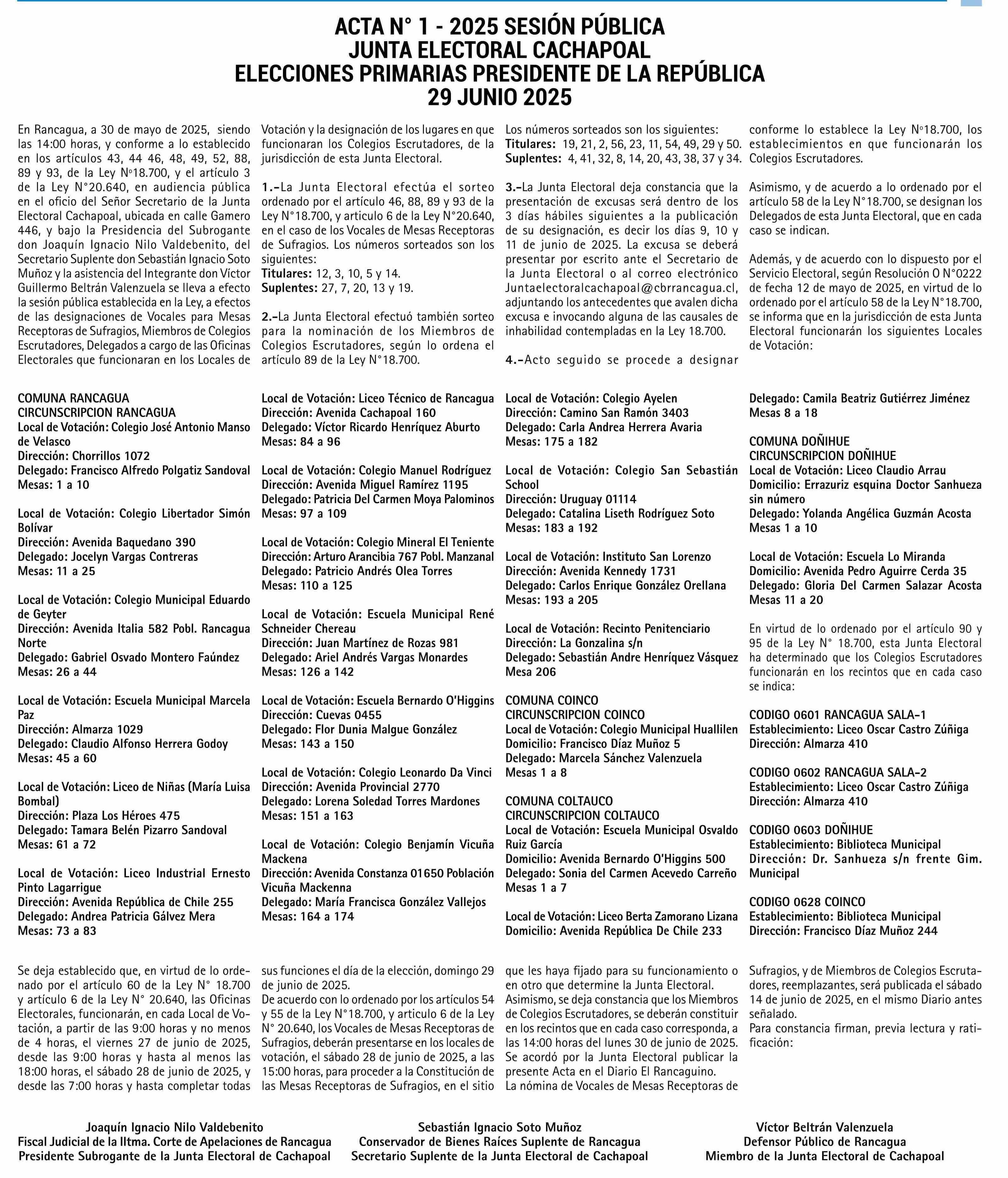 EXTRACTOS: ACTA N” 1 2025 SESION PUBLICA JUNTA ELECTORAL CACHAPOAL ) ELECCIONES PRIMARIAS PRESIDENTE DE LA REPUBLICA 29 JUNIO 2025 07-06-2025 El Rancagüino |