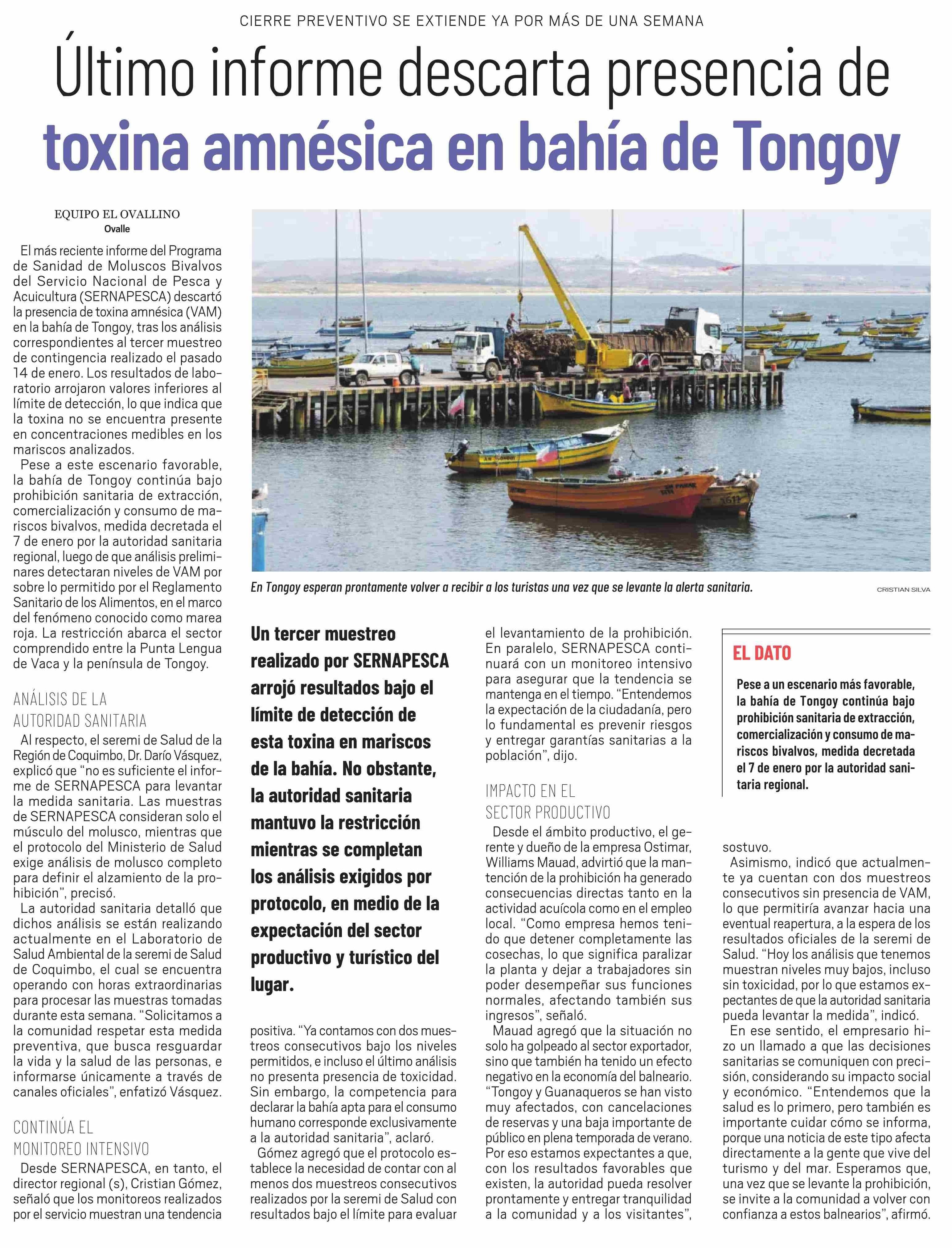 Último informe descarta presencia de toxina amnésica en bahía de Tongoy 16-01-2026 El Ovallino |