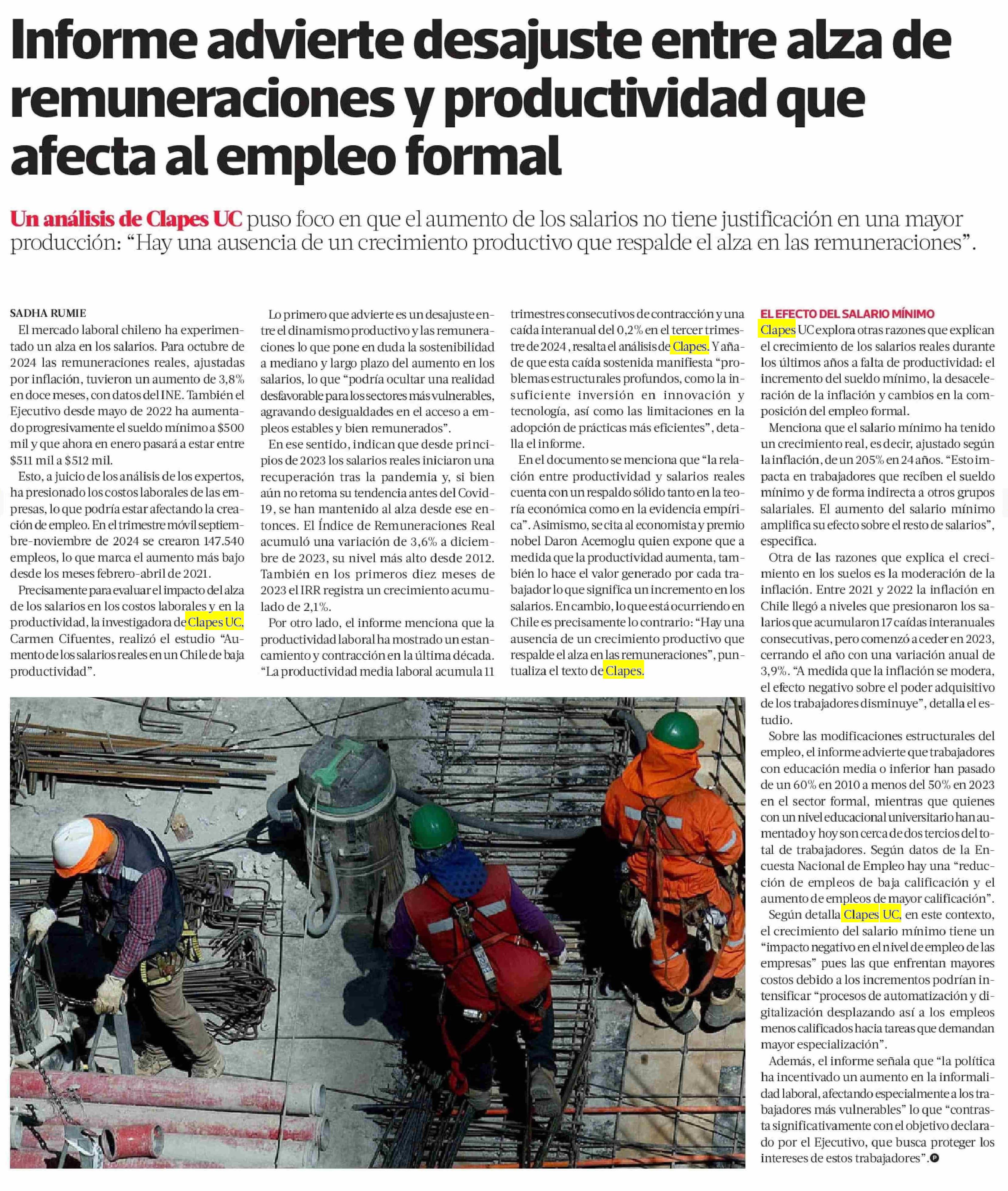 Informe advierte desajuste entre alza de remuneraciones y productividad que afecta al empleo formal 06-01-2025 La Tercera |