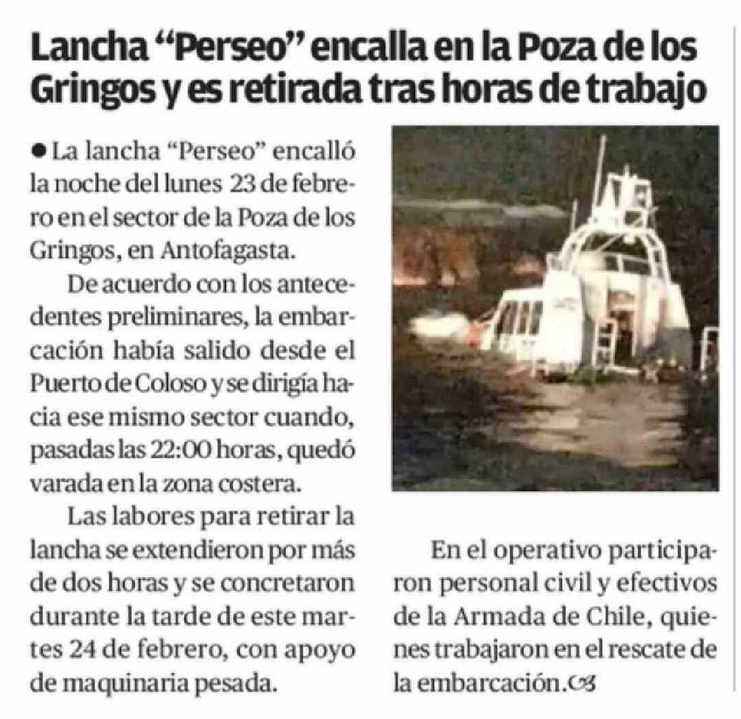 Lancha "Perseo" encalla en la Poza de los Gringos y es retirada tras horas de trabajo 26-02-2026 El Mercurio de Antofagasta |