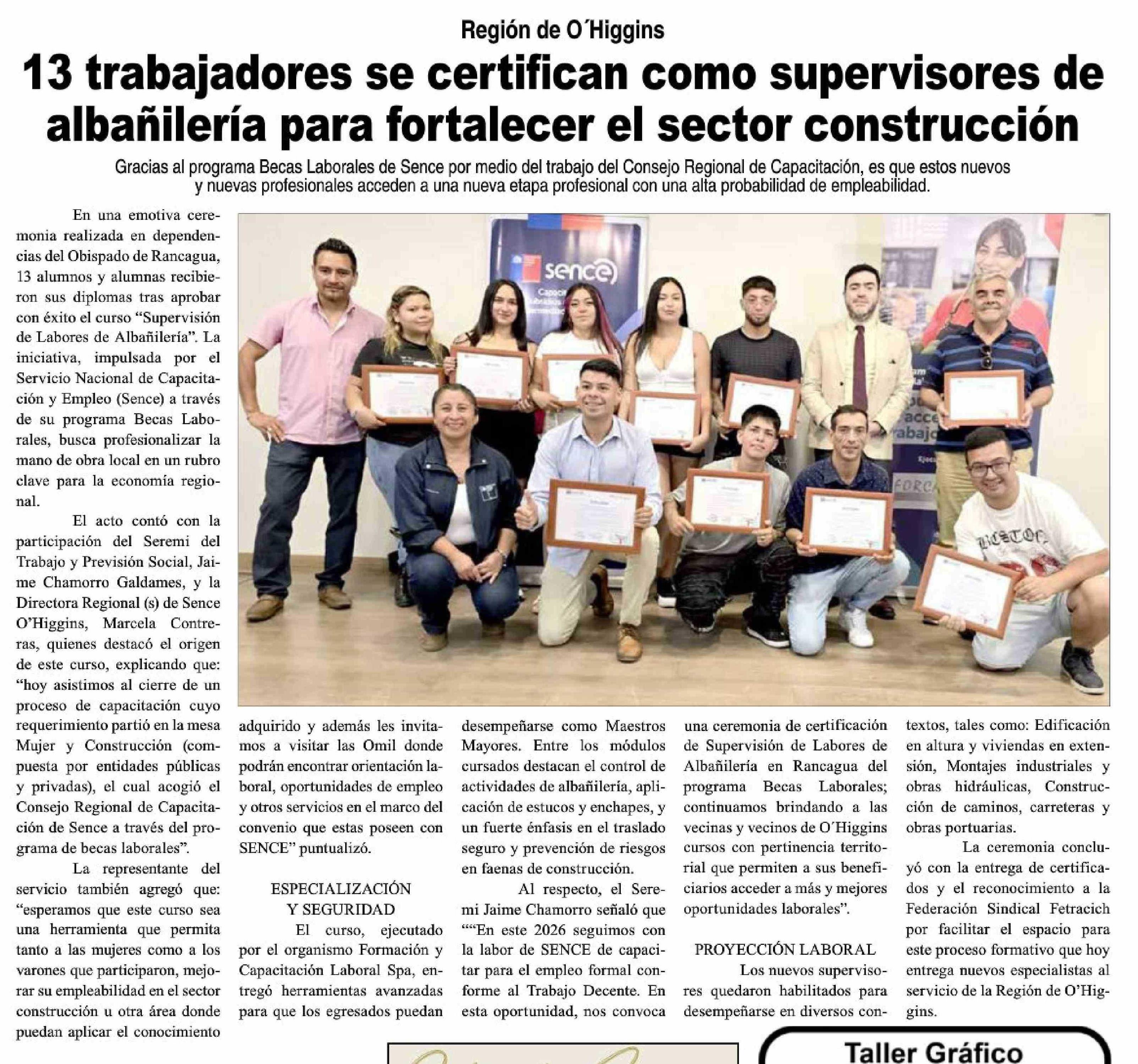 13 Trabajadores se certifican como supervisores de albañilería para fortalecer el sector construcción 20-01-2026 Diario VI Región |